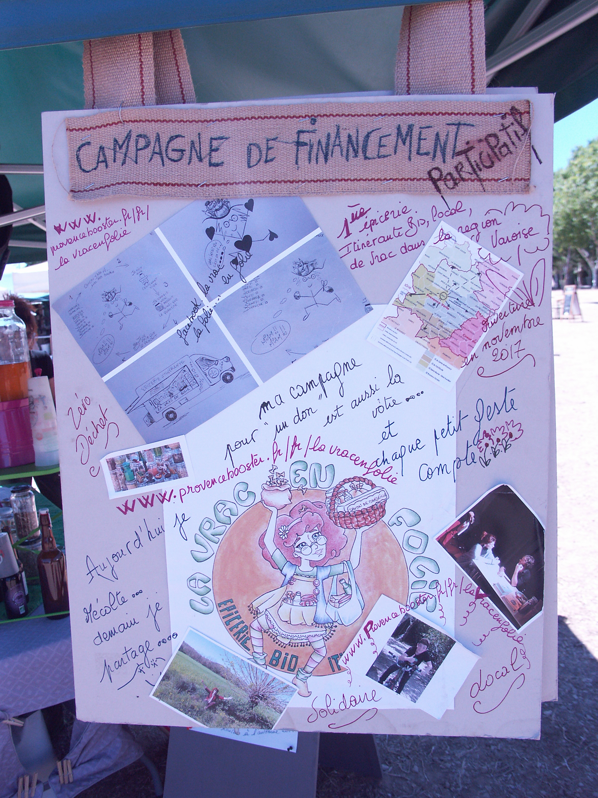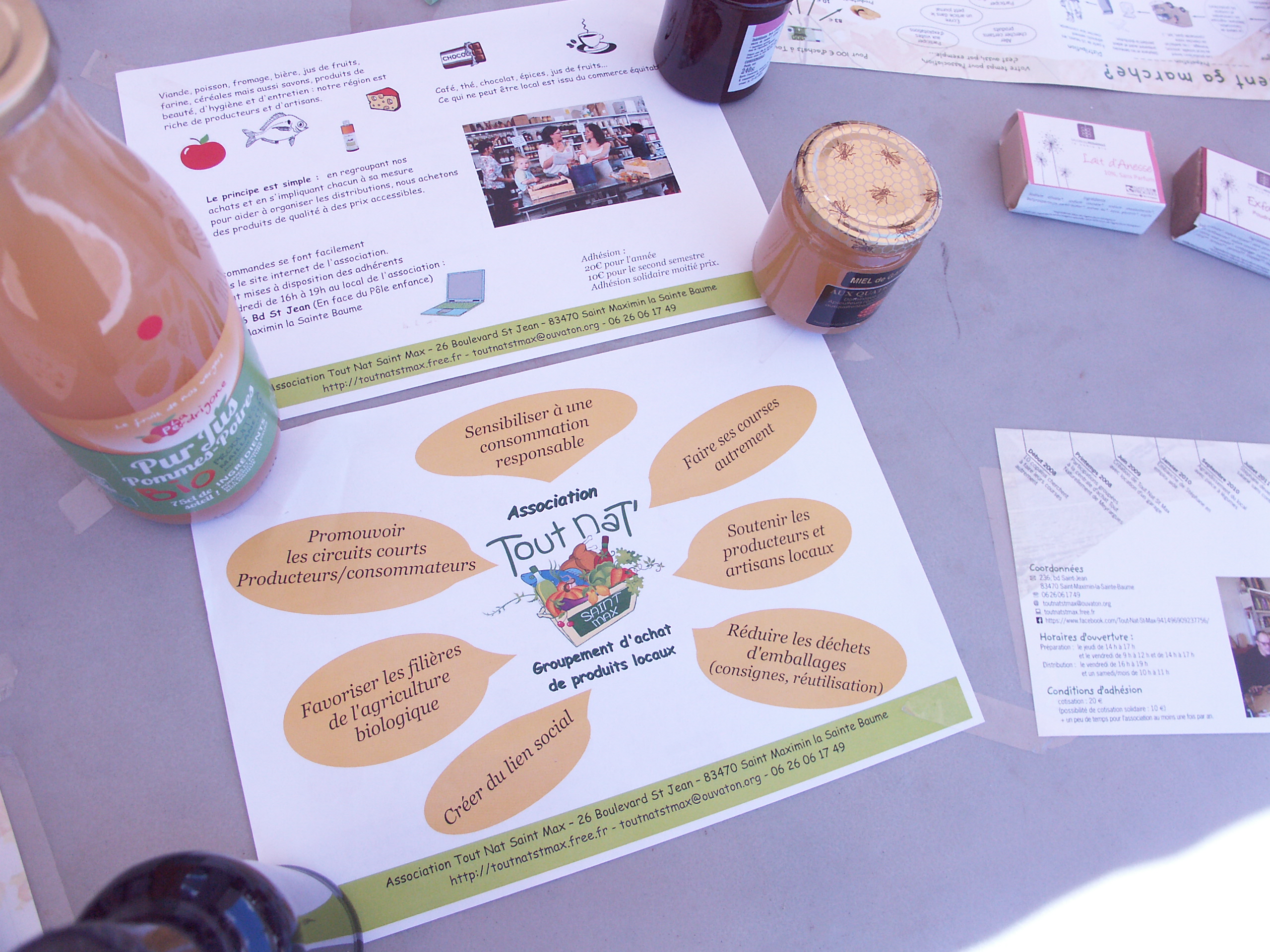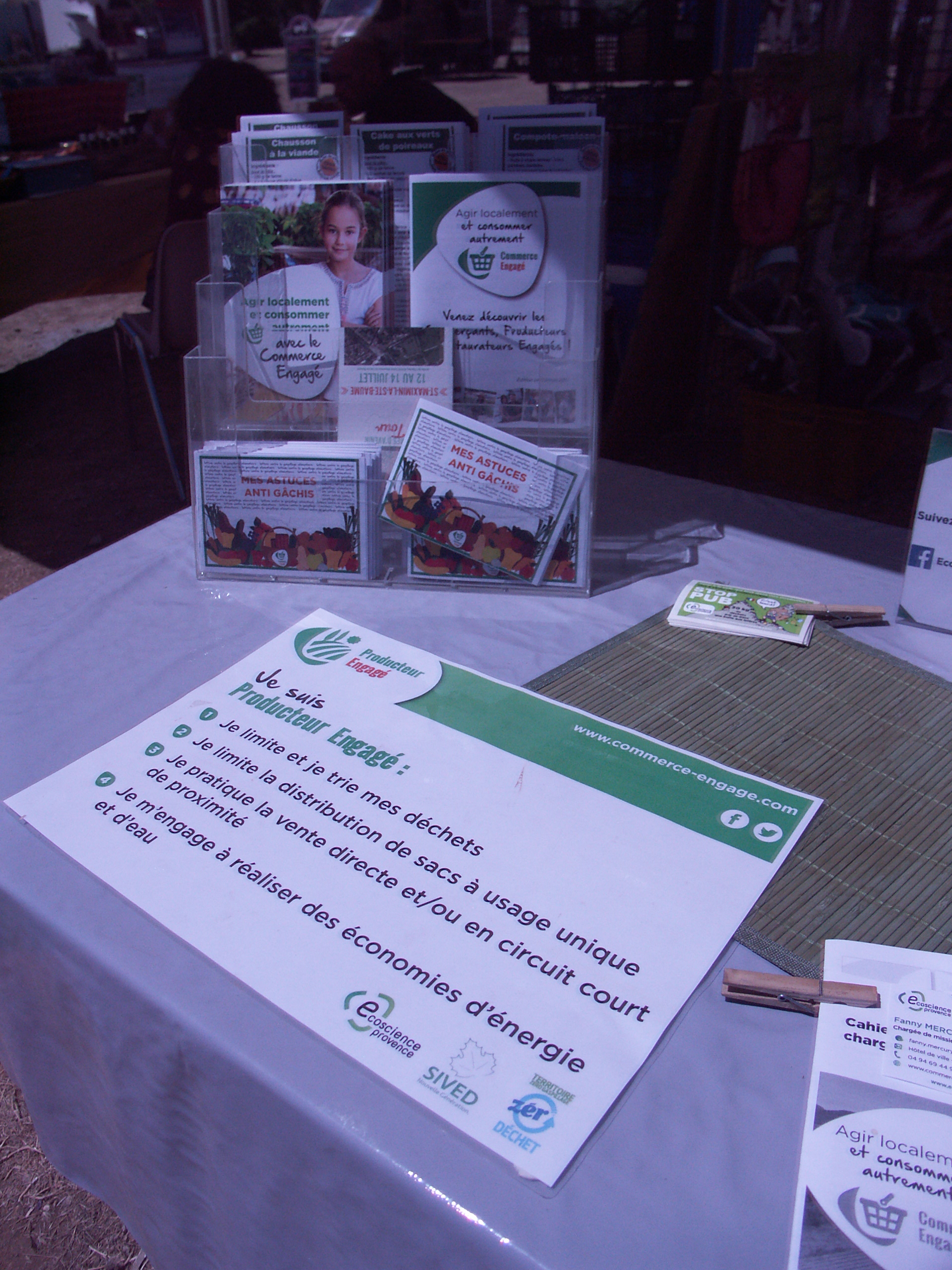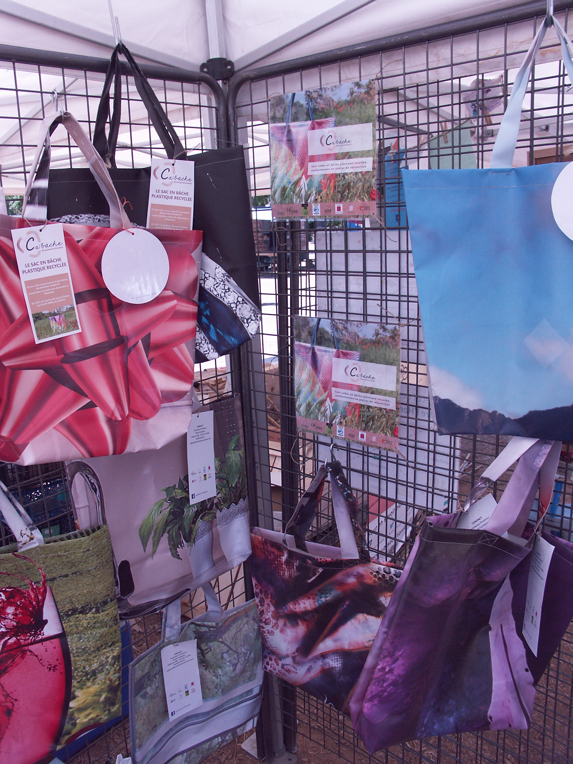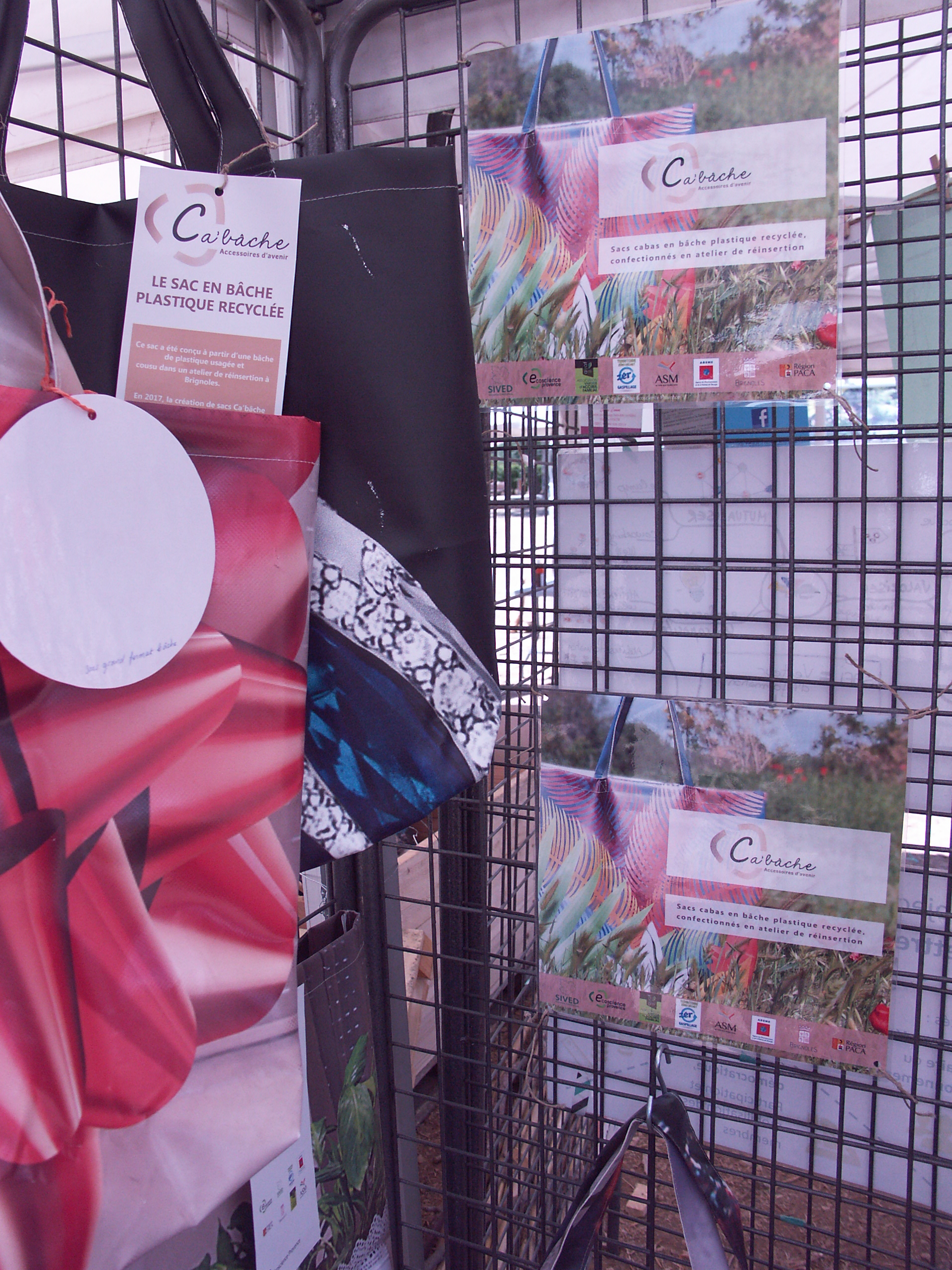- J’étais ravie de trouver le stand d’Ecoscience et commerces engagés. Car j’avais suivi de loin depuis quelques temps, tout ce qu’ils mettent en place. Entre autre la création d’une charte respectueuse de l’environnement pour les commerces, les restaurateurs et les producteurs. La mise en avant des petits commerces locaux. Le retour de la consigne pour le verre. La lutte contre le gaspillage. Et également un beau projet transversale , les sac CA’bâche. Des cabas fabriqués à partir de bâches publicitaires ,principalement de la ville où est implantée l’atelier (Brignoles), cousus par des personnes en réinsertion. La création de ces sacs aura évité 840kg de déchets !Tout pour me plaire 🙂 leur site