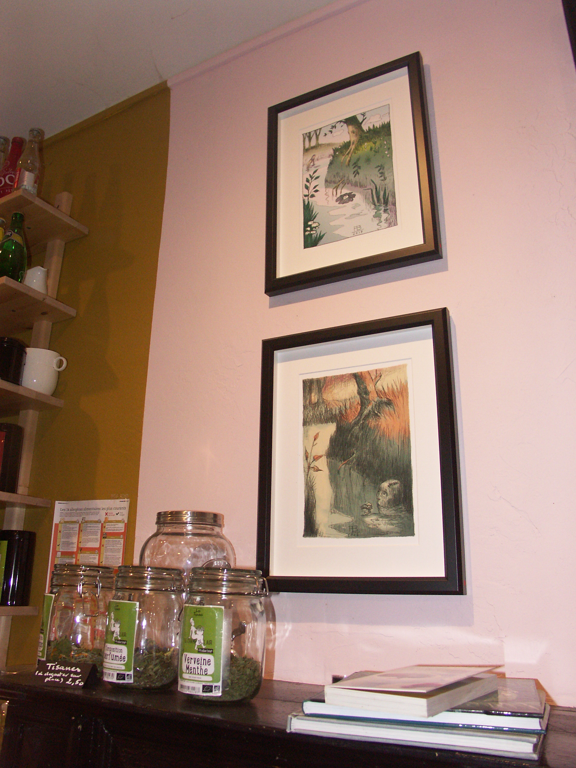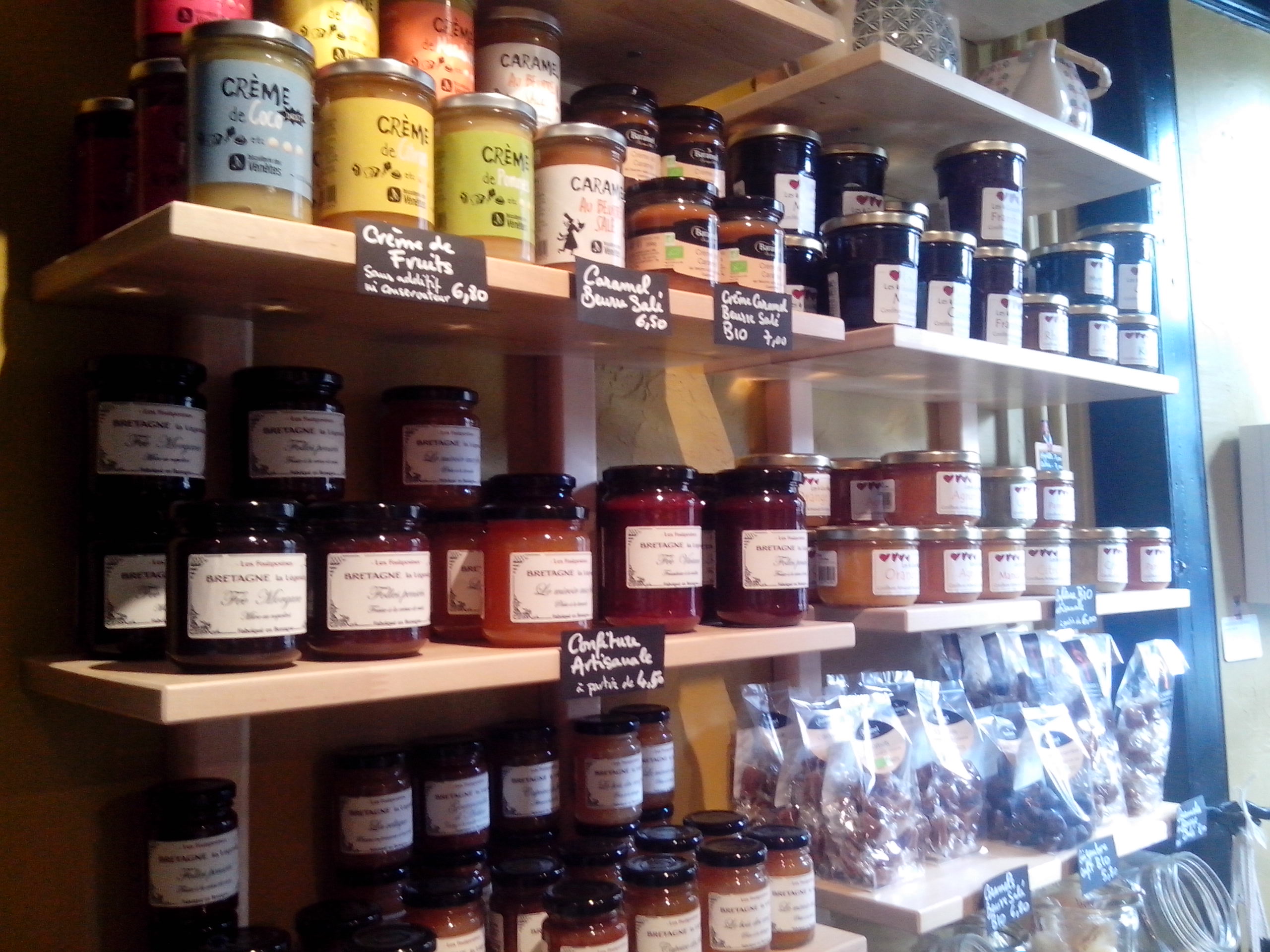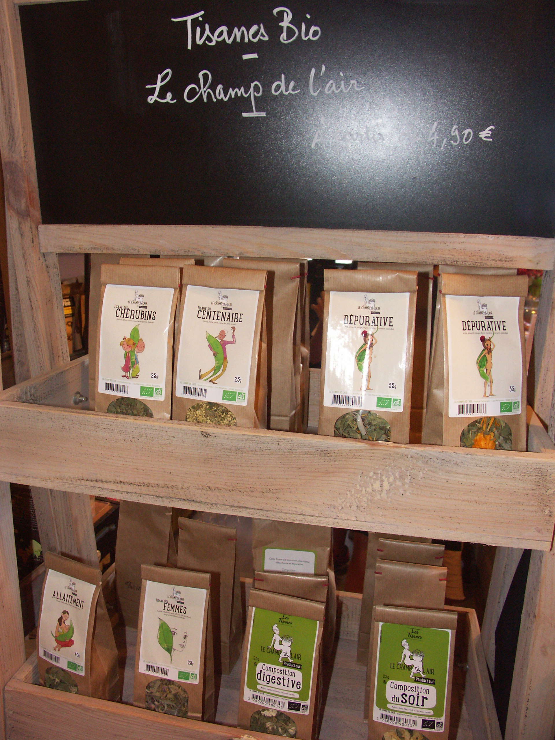 J’ai pris un thé original (aux algues et au gingembre) dans le café librairie Petit bazar breton. Qui possède un coin épicerie locale, où j’ai craqué pour des confitures Fraises à la violette, et Mûres aux coquelicots des Fruitpotines. J’ai pris connaissance d’une nouvelle marque de tisane locale Le champ de l’air, projet féminin , autour des plantes médicinales traditionnelles.