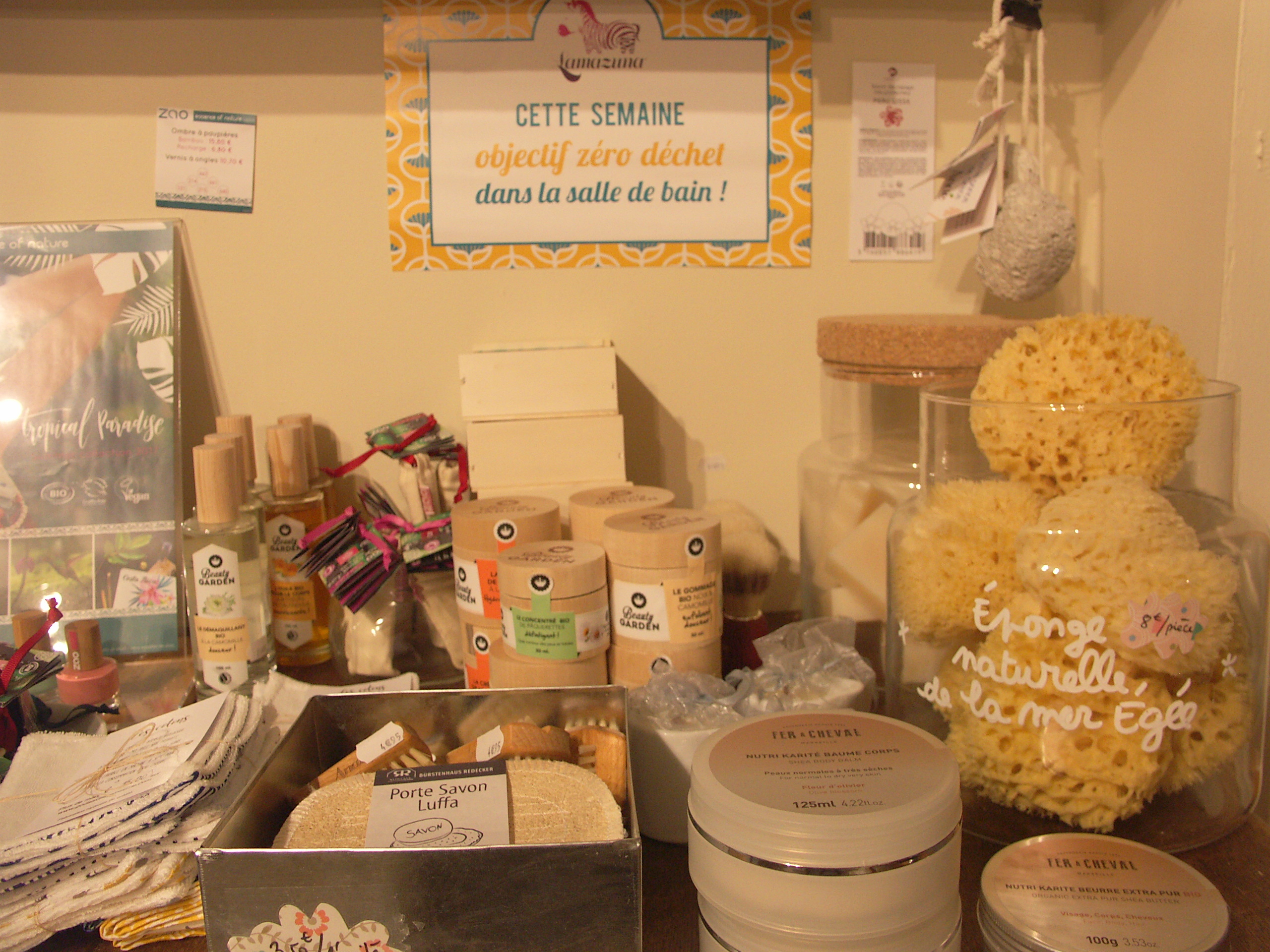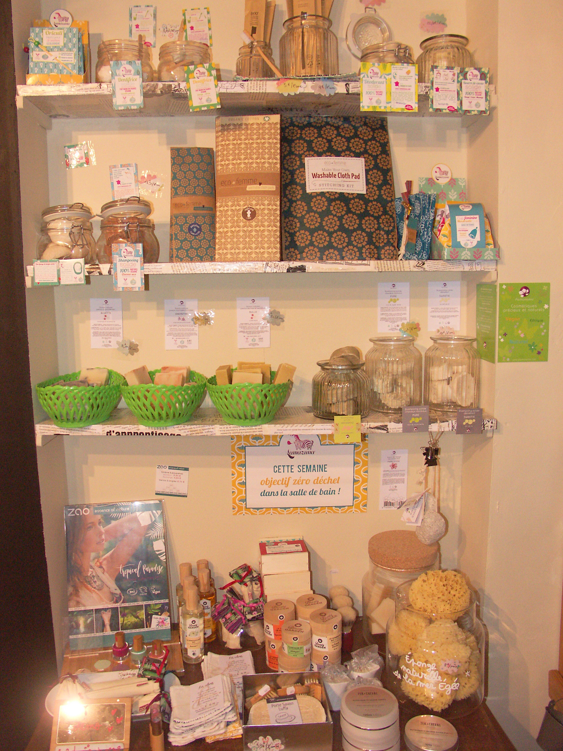 Ici il est fortement conseillé d’amener ses sachets en tissus et ses boites en tous genres.Le zéro déchet est un réel objectif pour la gérante des lieux. Elle prône le changements des habitudes en douceur et par ces deux piliers qui feront toute la différence :la cuisine et la salle de bain. Si vous commencez à modifier votre manière de vivre dans ces deux domaines, vous verrez que votre poubelle va réduire d’un grand coup ! Pour la salle de bain, vous trouverez pains de savons, shampoings solides, oriculis (pour remplacer les cotons tiges), serviettes hygiéniques ou cotons à démaquiller lavables,   cup menstruelles, dentifrices solides, brosses à dents en bambou, éponges naturelles etc…