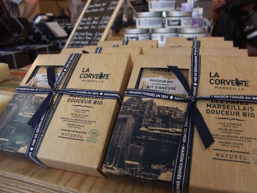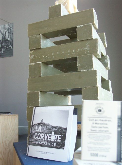 Cette boutique qui sera ouverte jusqu’en février 2018, se situe dans les voûtes de la Major, à Marseille donc. Juste sous l’esplanade de la belle cathédrale en tricot rayé , Sainte Marie la Majeure. Que tout le monde appelle La Major. Un choix symbolique, un lieu juste en face de la méditerranée , et surtout du port, à côté des anciens docks. Un lien à la mer fort, puisque le choix du nom et du logo font référence, à un petit trois mâts qui servait au XIXème siècle, au transport des matières premières en direction des savonneries marseillaises. De toute manière Marseille, sans la mer ne serait pas Marseille ! Un clin d’oeil aussi à l’export, car La Corvette voyage toujours, et se retrouve dans au moins 30 pays différents.