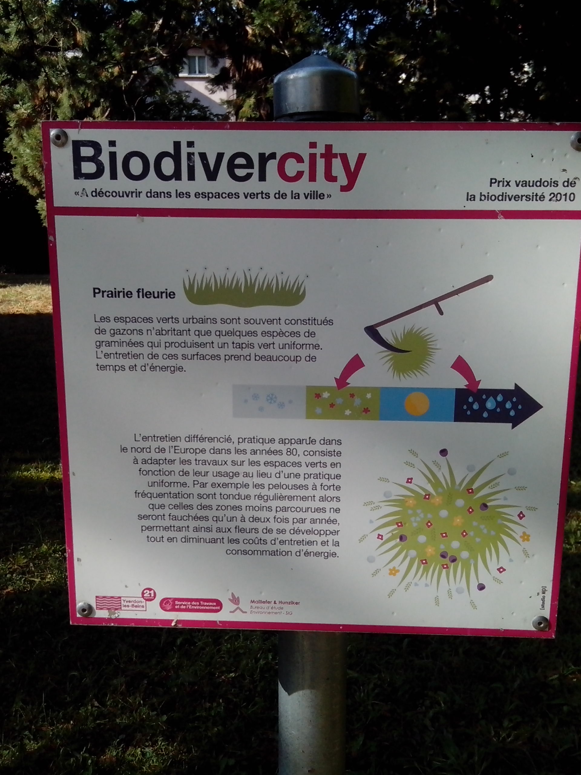 Pour bien commencer ma journée, après mon tour de marché et d’épicerie de vrac, je me suis rendue au centre thermal d’Yverdon. Pour le coup , c’est assez raisonnable niveau prix, environ 18 euros (19 francs suisses) pour 3h dans les piscines à jets, bulles remous etc à faire absolument ! On ressort de là un peu fourbus mais légers ! Je me suis déplacée uniquement à pieds, tout est très bien indiqué. Après ce moment détente, pique nique avec mes achats du matin dans le parc du centre thermal. Partout, on peut trouver des panneaux explicatifs des initiatives mises en place par la commune concernant le respect de l’environnement.