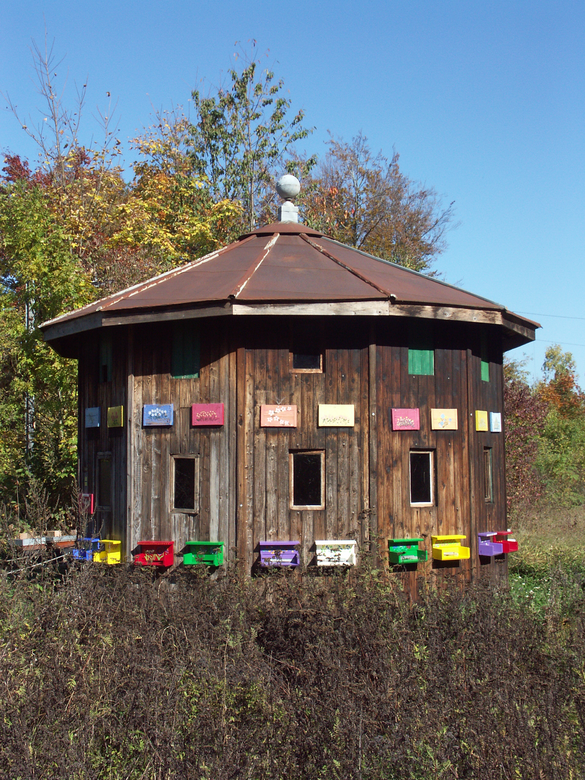 Je me suis donc enfin rendue au bout de 45 minutes de marche au Parc Pronatura…mais ça, je vous en parlerai dans un prochain article. Ce lieu est tellement beau qu’il mérite un article rien que pour lui ! Je vous donne en attendant un avant goût , en vous montrant la très belle ruche du domaine .