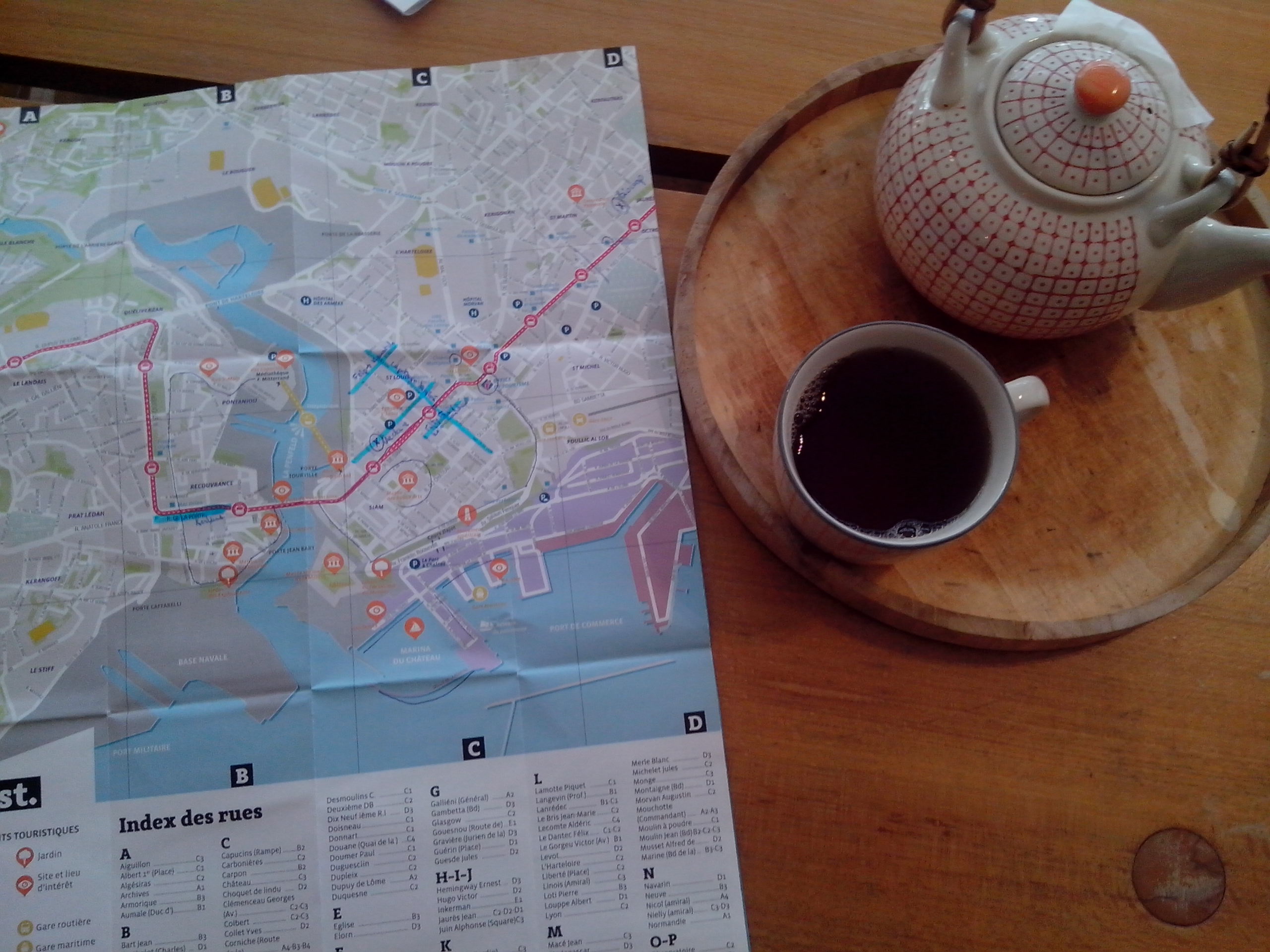 Brest est une ville plutôt bien desservie en transport en commun, je me suis principalement déplacée en tram, en bus et à pieds. Donc à peine sortie du tram, avec quelques adresses en poche, je suis partie à la recherche d’un salon de thé-brocante-magasin de créateurs le Fifty-Fifty (22 rue Boussingault). Où j’ai bu un bon thé d’halloween , même si ce n’est plus la saison, à la carotte et au potiron. Un lieu agréable, où l’on peut également se restaurer. La gérante est très aimable, elle m’a donné plein de bonnes idées de lieux à visiter et m’a partagé avec passion les atouts de son bout de terre.
