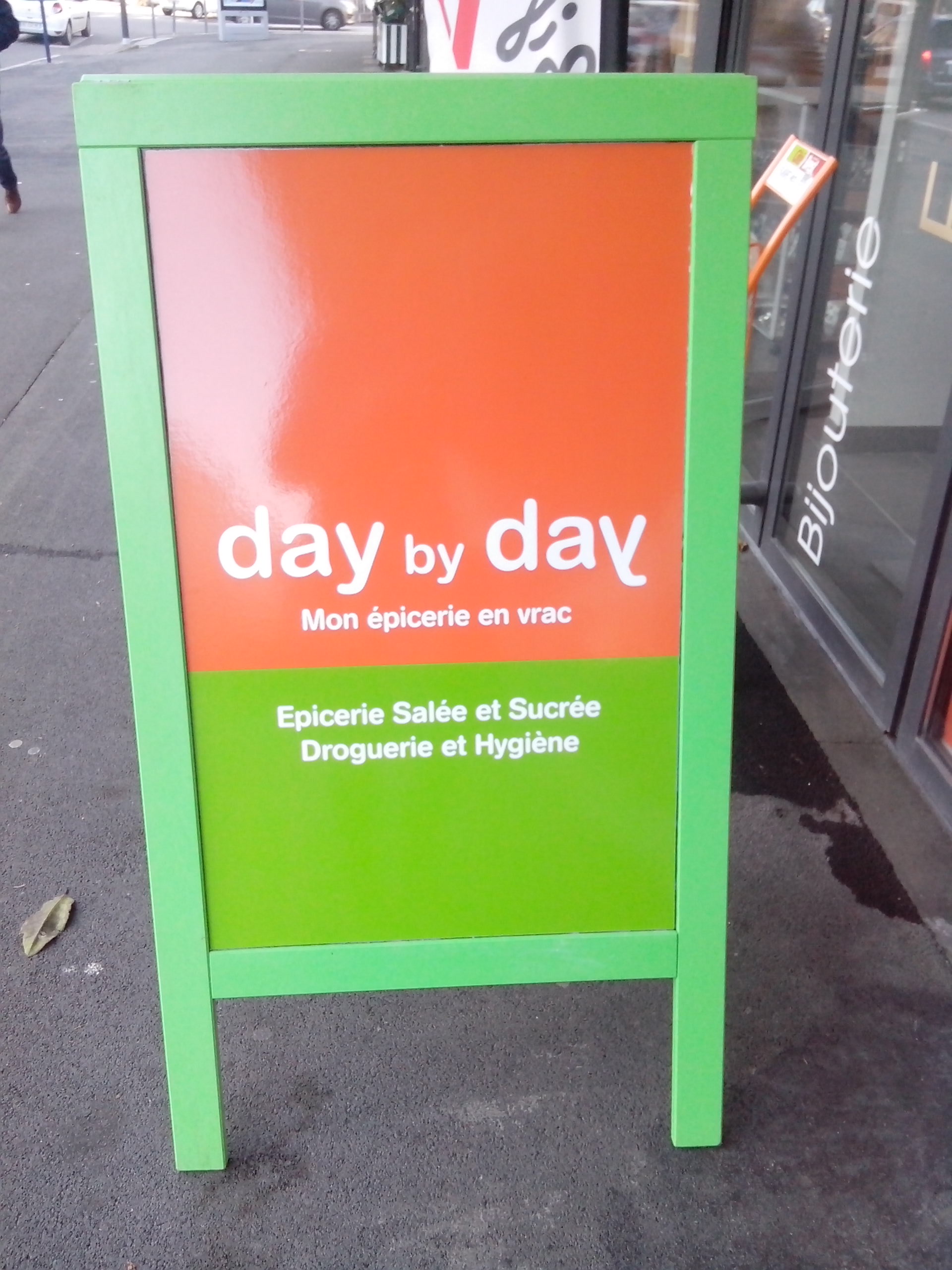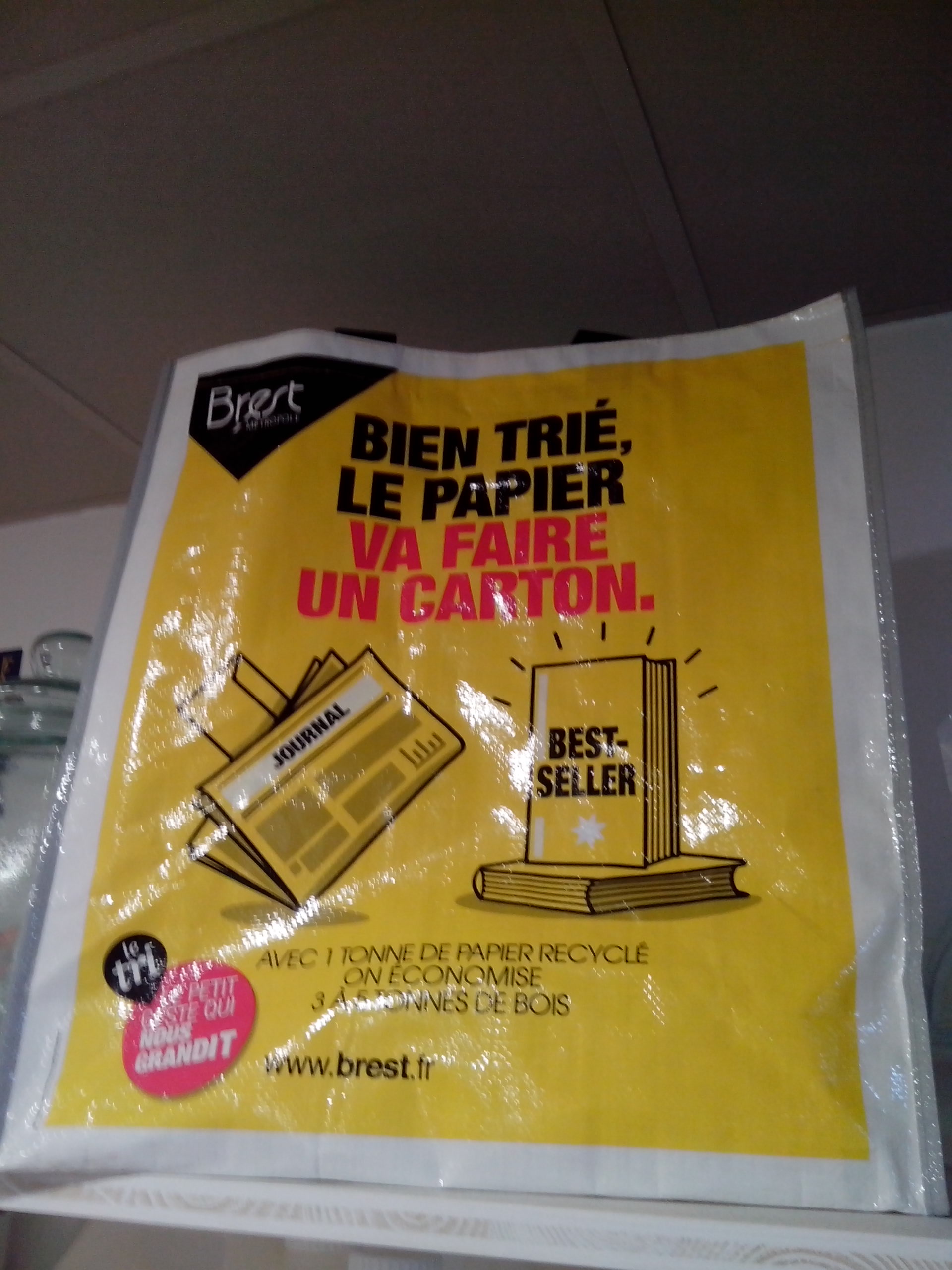 Comme je dormais en auberge de jeunesse, et que donc je pouvais « cuisiner » . Mais aussi du fait d’être venue en avion,( une première pour moi) niveau culpabilité d’écolo, j’étais au maximum. J’ai décidé de ne manger que des produits frais et en vrac pendant mon séjour. Bref, de faire le moins de déchets possible, comme quand je suis chez moi. Donc, pendant mon premier petit tour de centre ville, j’ai cherché des magasins bio. Car je savais que j’y trouverais du vrac. Mais le hasard m’a mené vers mieux encore ! Une épicerie 100% vrac , de la chaîne day by day. Où on trouve de tout, même des croquettes pour nos animaux de compagnie, en vrac. J’y ai découvert, que le tri du papier à Brest était une sujet important. Sur le sac (ci dessous) nous pouvons lire, avec 1 tonne de papier recyclé, nous pouvons économiser 3 à 5 tonnes de bois. Day by Day Halles Saint Louis rue de Lyon .