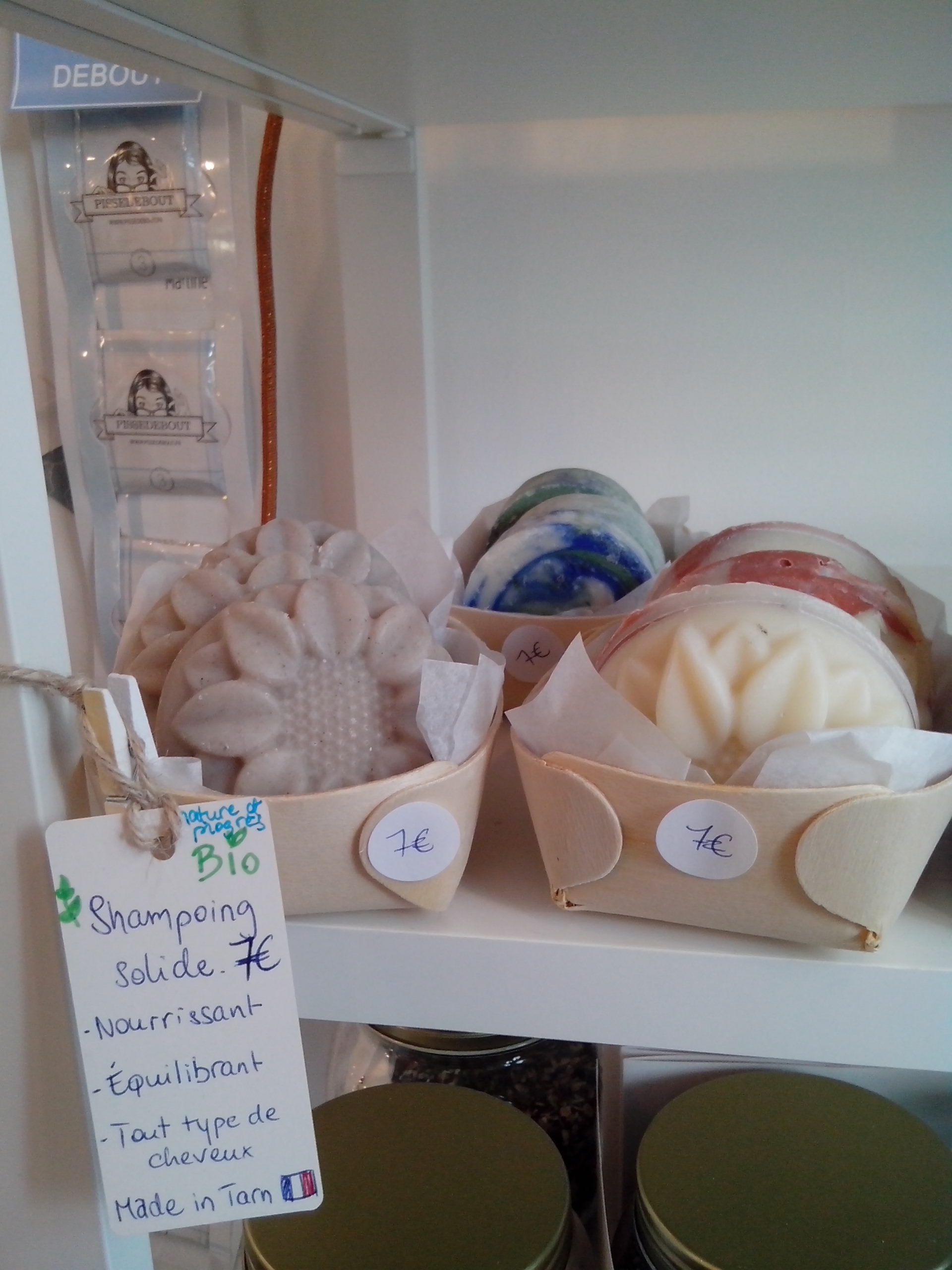 Et en centre ville, rue Sainte Colombe La Recharge ,dont les produits sont en grande majorité locaux ! Il y a même un rayon librairie, entre l’eau de cologne et les copeaux de savons en vrac. Je suis repartie avec une tisane ensoleillée qui sentait bon les fruits, à offrir à ma prochaine hôtesse.