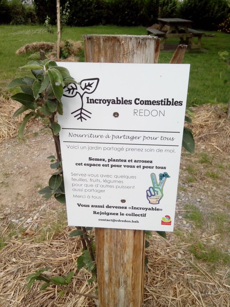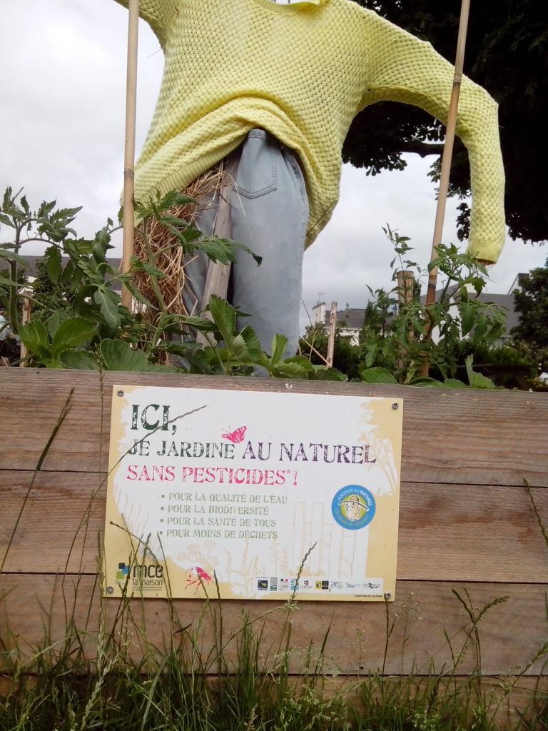 Ma première étape fut l’auberge de jeunesse de Poitiers, très tard dans la soirée. Puis le lendemain, une étape plaisir à Guérande, puis une sieste dans la voiture, avant d’aller passer mon entretien, qui s’est très bien passé, très bon feeling et des projets proches de mes valeurs. J’ai dormi ensuite à l’auberge de jeunesse de Redon. Où j’ai appris à jouer au palet breton , une sorte de pétanque, avec de grosses pièces de monnaie à l’ancienne et une planche en bois qui délimite la zone de jeu. En marchant dans Redon le lendemain, j’ai eu le plaisir de tomber sur plusieurs potagers urbains des Incroyables Comestibles. Avec leurs épouvantails super sympas et des oeuvres de landart avec de la récup . Carillon avec des couvercles de bocaux, tableaux de morceaux de céramiques… Avec des composteurs non loin.