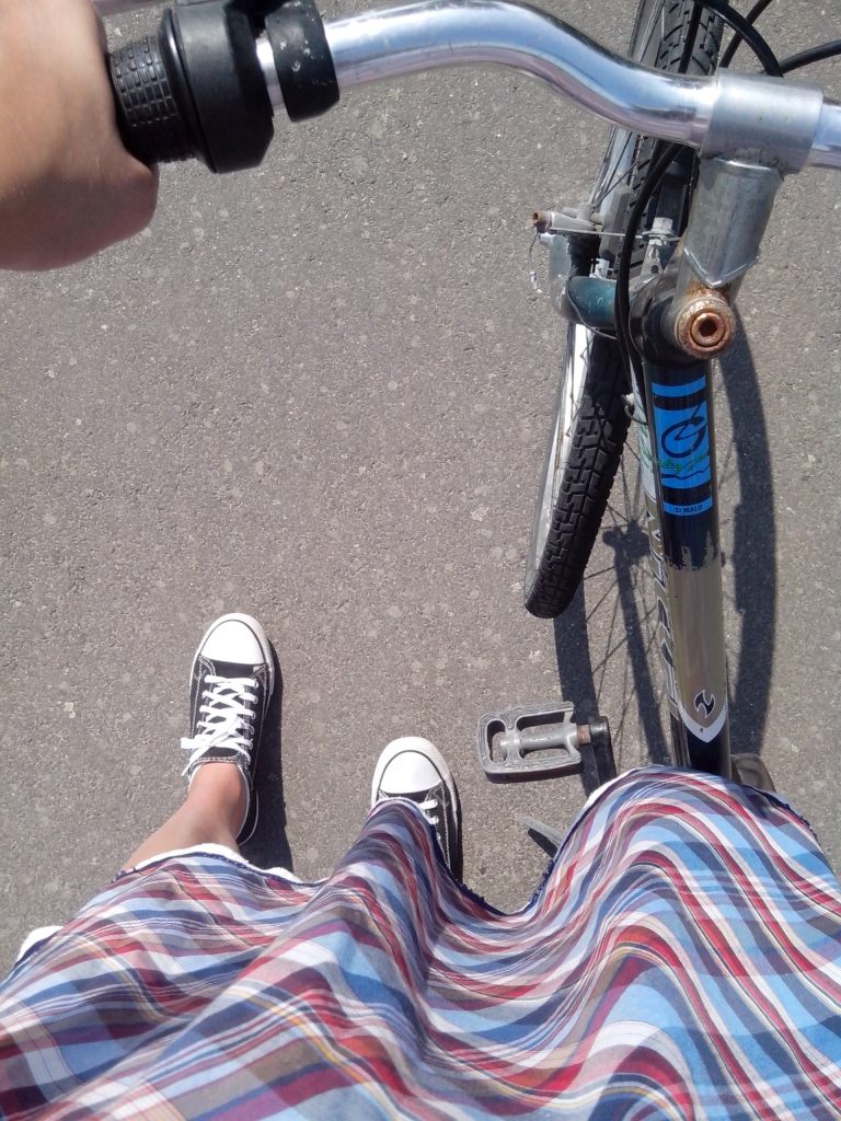 Pour terminer avec mes petits bonheurs. Il y a deux choses dont je suis très contente : Je continue à me tenir à mon défi « me remettre eu vélo » ! Et je prends de plus en plus de plaisir à rouler en bicyclette. sponsorisée par la FUAJ 😉 la robe au vent, pour découvrir de nouvelles plages ou aller au marché.