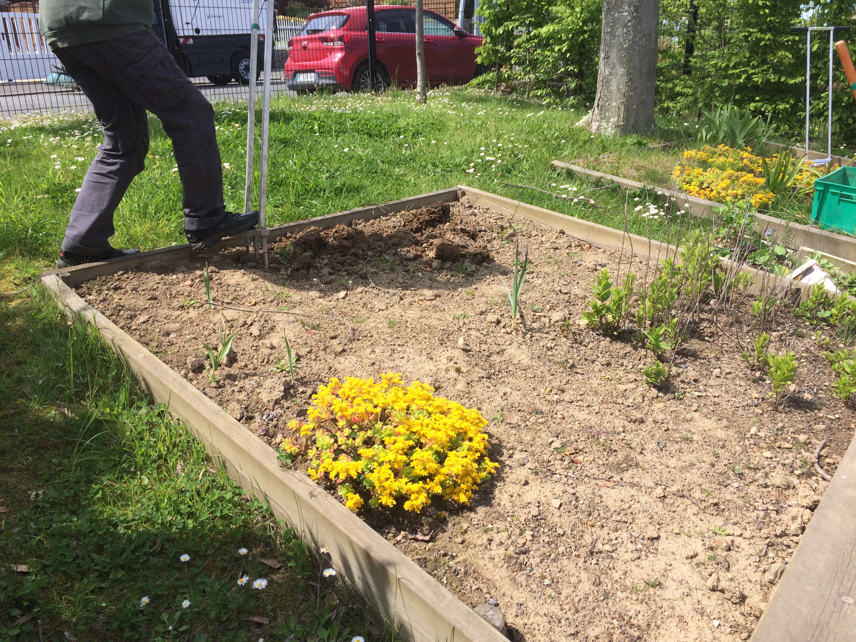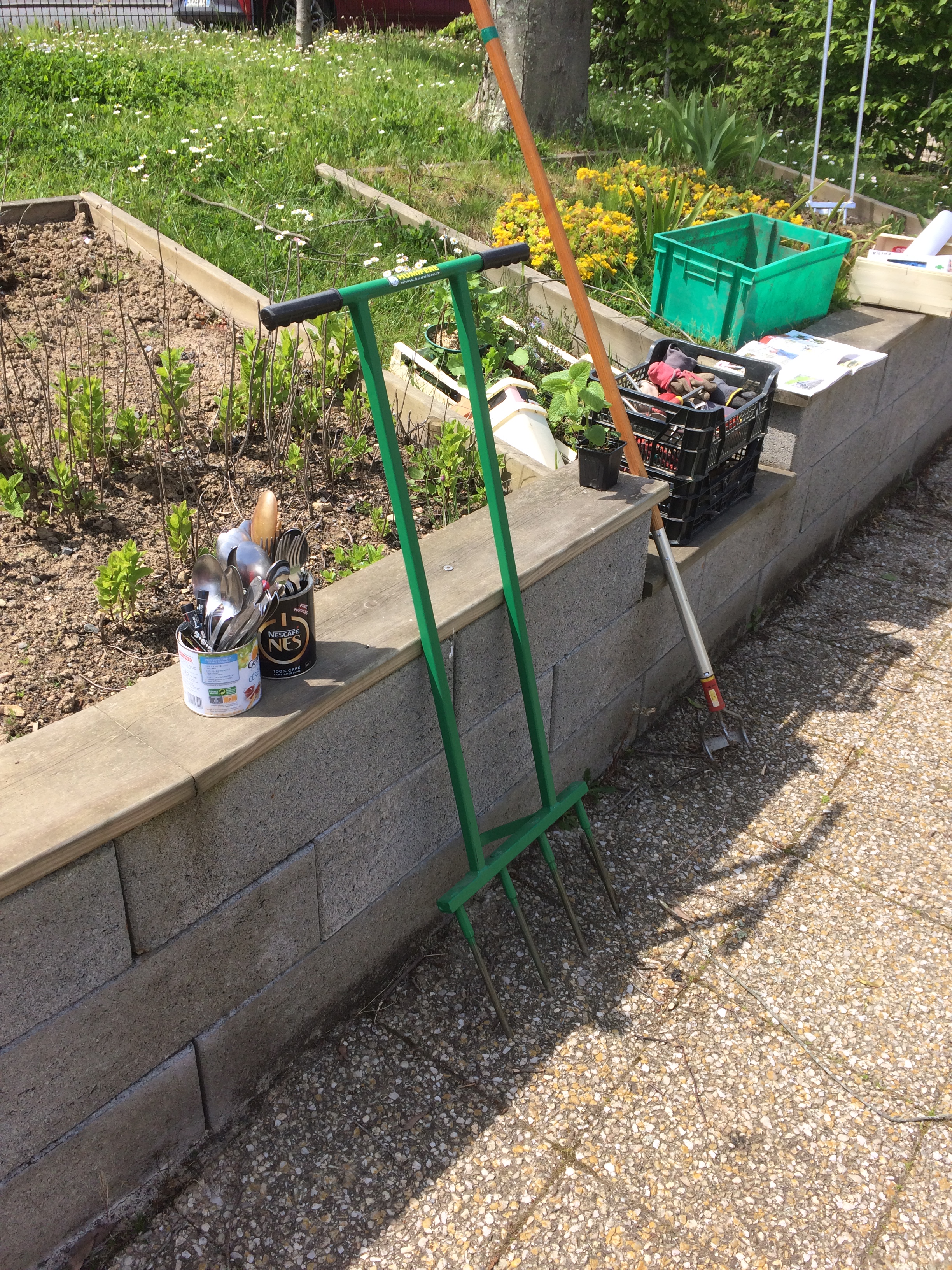 En avril, j’ai ensuite participé à un atelier de jardinage intitulé « Cultivez votre santé ». Quelques heures les mains dans la terre pour commencer à apprendre les bons côtés qu’apporte le fait de manger les légumes et les fruits de son potager ou son balcon. De connaître les plantes aux bienfaits multiples pour notre santé. Mais également les bons gestes et les bons outils pour ne pas se faire mal au dos (comme la fameuse grelinette) . Nous avons donc commencé ce moment ensemble par le yoga du jardinier ! Vous pouvez retrouver cela dans le dernier magazine Les 4 saisons. J’ai trouvé ça très amusant et utile. Puis nous avons planté des fleurs pour ramener les pollinisateurs, des plantes aromatiques, quelques pieds de framboisiers et de fraisiers…Et surtout nous avons bien discuté, et échangé nos connaissances. J’ai appris ainsi que pour éviter d’acheter les plants dans des grandes surfaces ou des jardineries de grande distribution,nous pouvions nous rapprocher des lycées agricoles et horticoles des alentours. J’ai découvert un anti limaces naturel, la coque de sarrasin. Que notre animateur avait acheté chez un meunier du coin. Local et anti-gaspi , une bonne idée donc. Dans les bonnes idées récup’ , nous avons utilisé des grosses cuillères ou des fourchettes en inox pour inscrire le nom des plantes.