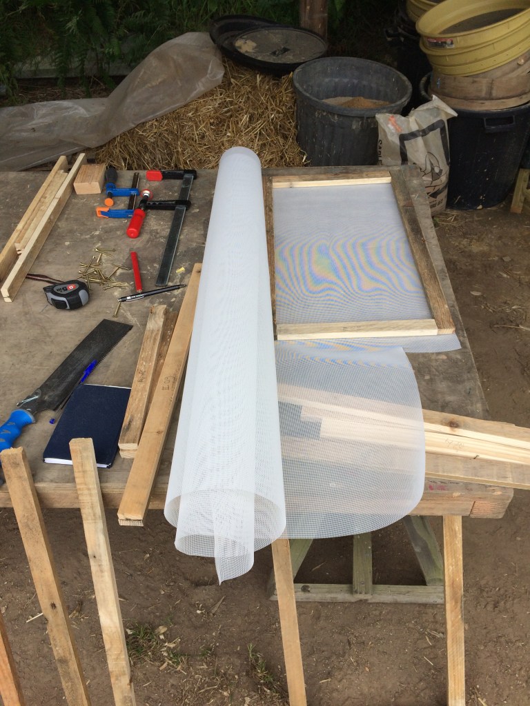 Etape suivante couper les morceaux tous à la bonne taille afin de créer le cadre du séchoir (environ 60cm de longueur sur 27,5 de largeur, mais vous pouvez adapter selon votre espace et vos besoins) .Poncer pour éviter les échardes et aplanir . Le voile plastifié utilisé pour le fond est également de la récupération. Le tendre sur le cadre et l’agrafer. Puis le coincer , en rajoutant des bords d’environ 7 cm.Ce qui permettra de laisser passer l’air tout en empilant les cadres.