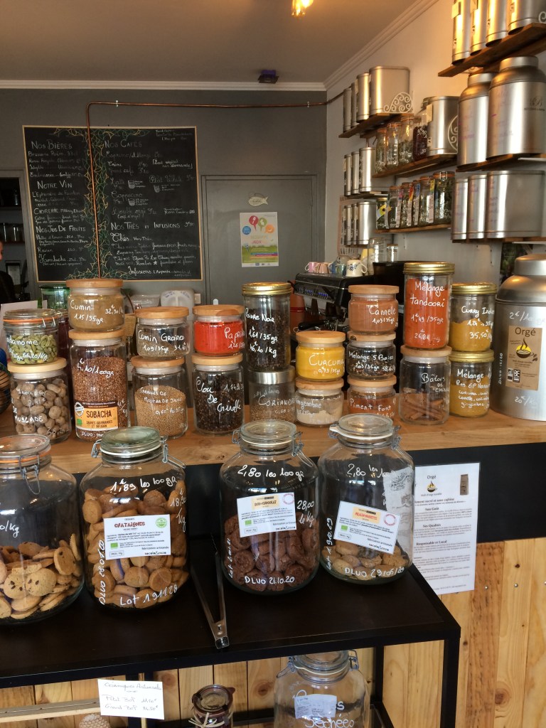 Au rez-de-chaussée , se trouve l’espace épicerie vrac et bio. Ici , comme dans ce que nous dégusterons, la majorité des produits sont issus du circuit court. Même les cosmétiques ou les créations zéro déchet.