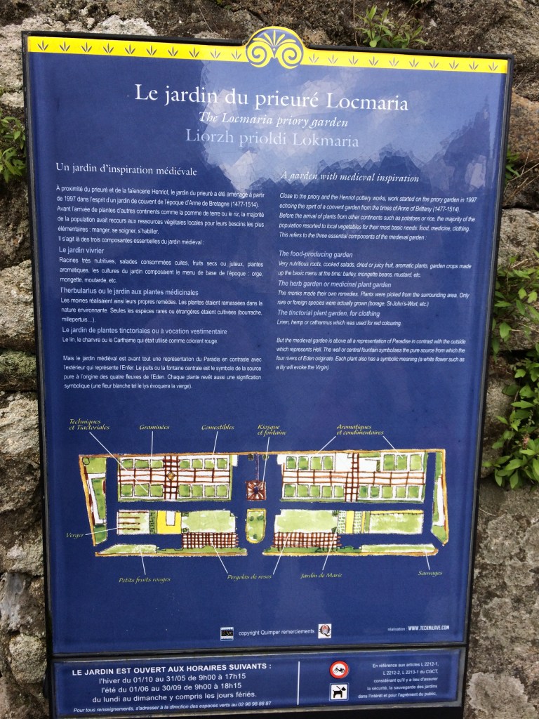 Sur le chemin du retour , vous pourrez vous balader dans le jardin de Locmaria. Ou vous instruire tout en vous prélassant sur un banc au soleil . C’est un jardin médiéval , de plantes aromatiques et médicinales, mais pas que….
