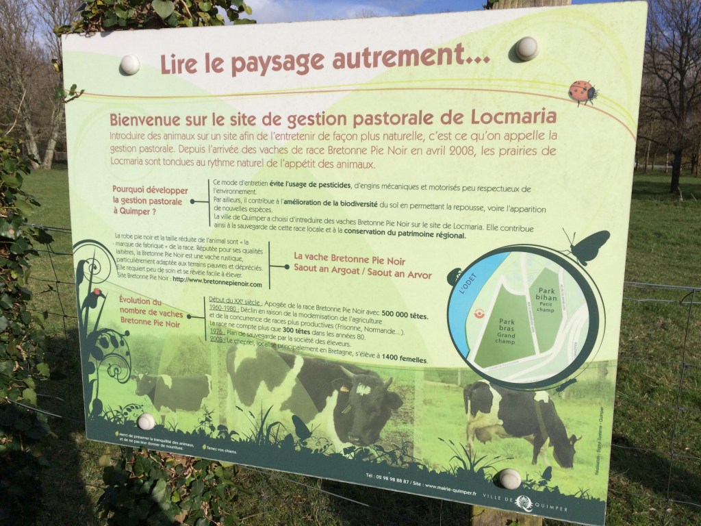 « Atouts à la fois économiques, environnementaux et sociaux, l’éco-pâturage pratiqué à Locmaria depuis 2008 a fait ses preuves. L’intérêt porté aux vaches par la population et l’entretien de la parcelle à moindre coût (30 centimes €/m² au lieu de 85 centimes €/m² pour une surface tondue) à conforter la Ville dans sa volonté d’étendre le projet. La gestion pastorale permet de sensibiliser facilement et efficacement les enfants ainsi que les adultes à l’importance de respecter et de protéger l’environnement, de connaître l’animal par son approche. Elle crée un environnement paisible pour la population en proposant une autre dimension sociale des espaces verts. » Source : quimper.bzh