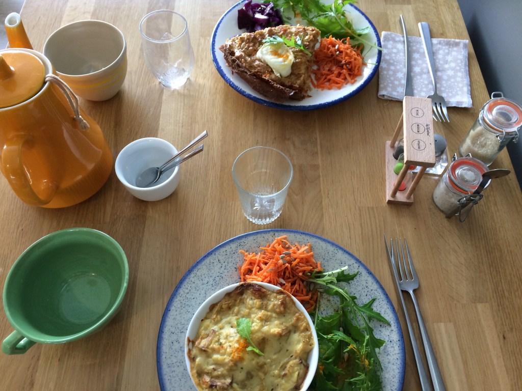 A l’étage , un espace lumineux , sobre et décoré simplement mais avec gout , afin de se poser dans les fauteuils pour boire un thé. Ou autour d’une table pour déjeuner . Les plats sont végétariens, vegan et/ou sans gluten, avec des produits locaux de saison. Il est possible aussi de prendre à emporter dans des contenants consignés.