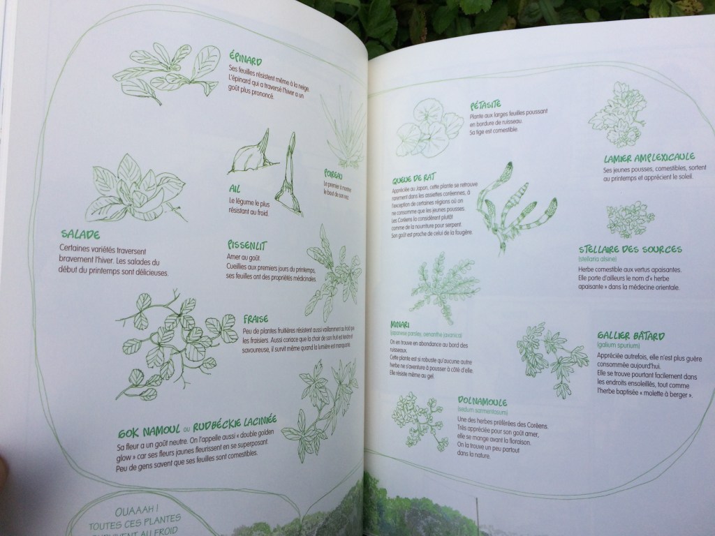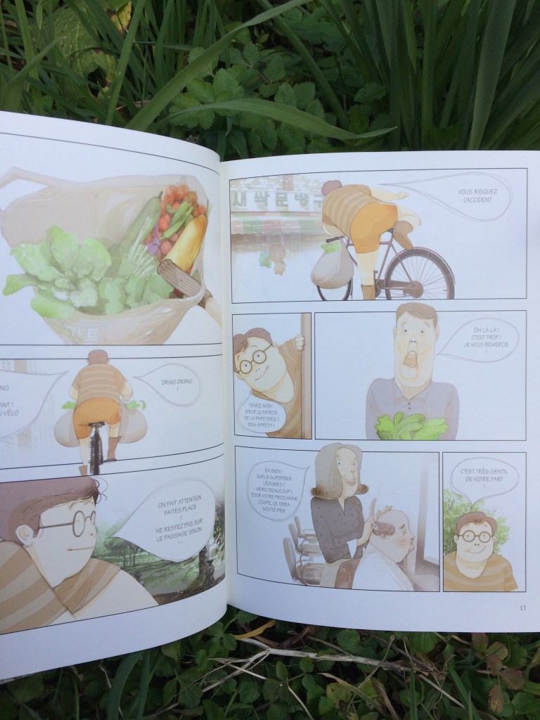 Certaines plantes nous sont connues, d’autres sont typiques de la Corée. Outre la transmission de savoirs et la solidarité. Cet ouvrage expose vraiment la réalité de ce que représente le choix de cultiver en bio. Il y a d’ailleurs souvent des altercations entre un personnage qui utilise des traitements chimiques et le personnage principal. Qui dit absence de pesticide, dit présence de parasites, feuilles croquées de ci de là. Et comment réagir face à ça….La vie au jardin c’est aussi prendre le temps d’observer et de s’adapter aux saisons. Et parfois accepter de tout perdre après une forte pluie ou un typhon. Des sujets importants tels que les semences stériles, et la mort des graines paysannes , y sont aussi abordés.