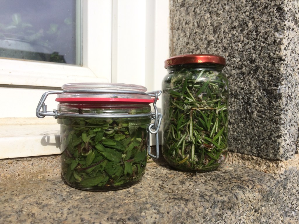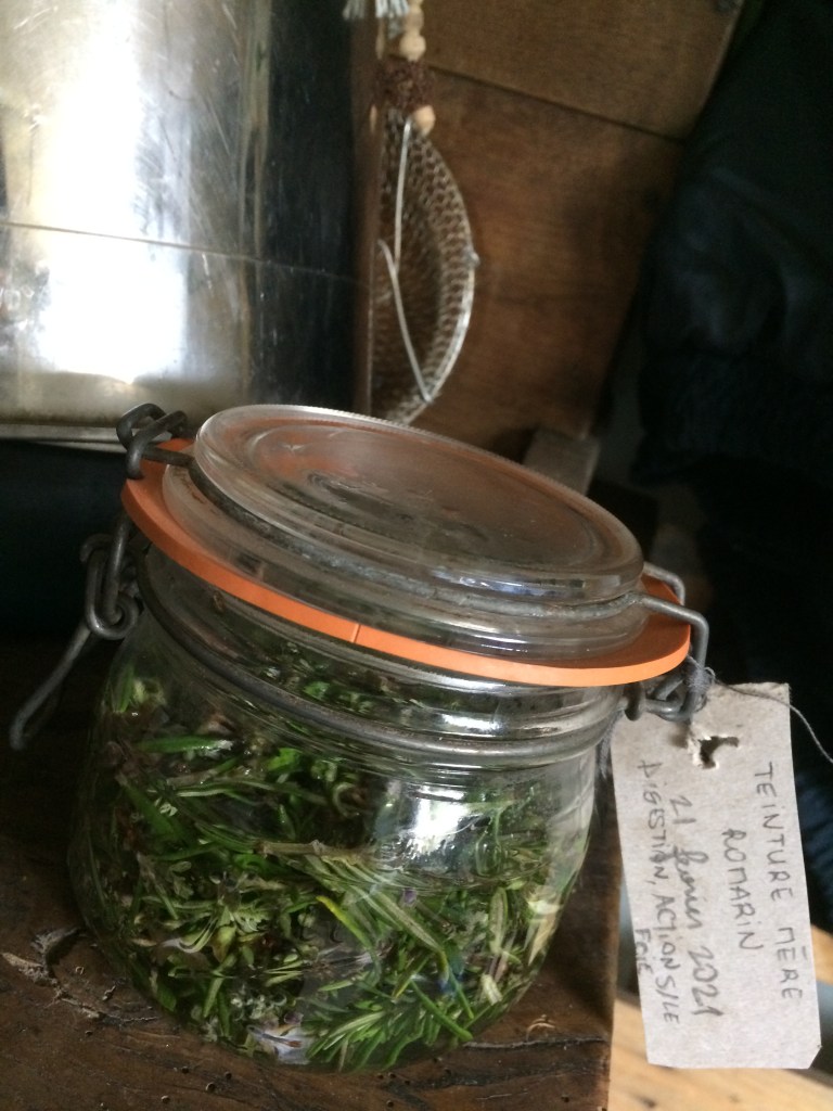 J’ai également mis en route une teinture mère de romarin (nous avons un énorme pied devant notre colocation) cette préparation pourra être prise en cure pour stimuler le foie, et le nettoyer. (toutes les informations que je vous donne là viennent du livre de Claudine Luu Se soigner au naturel )