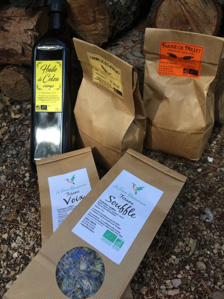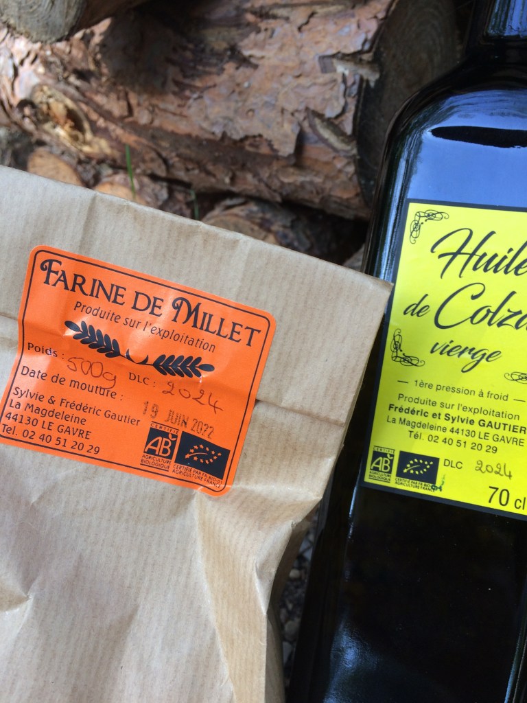 Même en vadrouille, j’ai un radar pour ces choses là . Et en passant voir une amie en Loire Atlantique, à la frontière avec l’Ille et Vilaine je suis repartie avec des souvenirs gourmands. Les tisanes de la ferme Buissonnière ont beaucoup de goût. Pour le reste , j’étais heureuse de trouver de la farine de millet locale, ne mangeant pas de gluten c’est une farine que j’apprécie. Et l’huile de colza fait partie de mes préférées ! Cela vient de la ferme de la Magdeleine au Gavre.