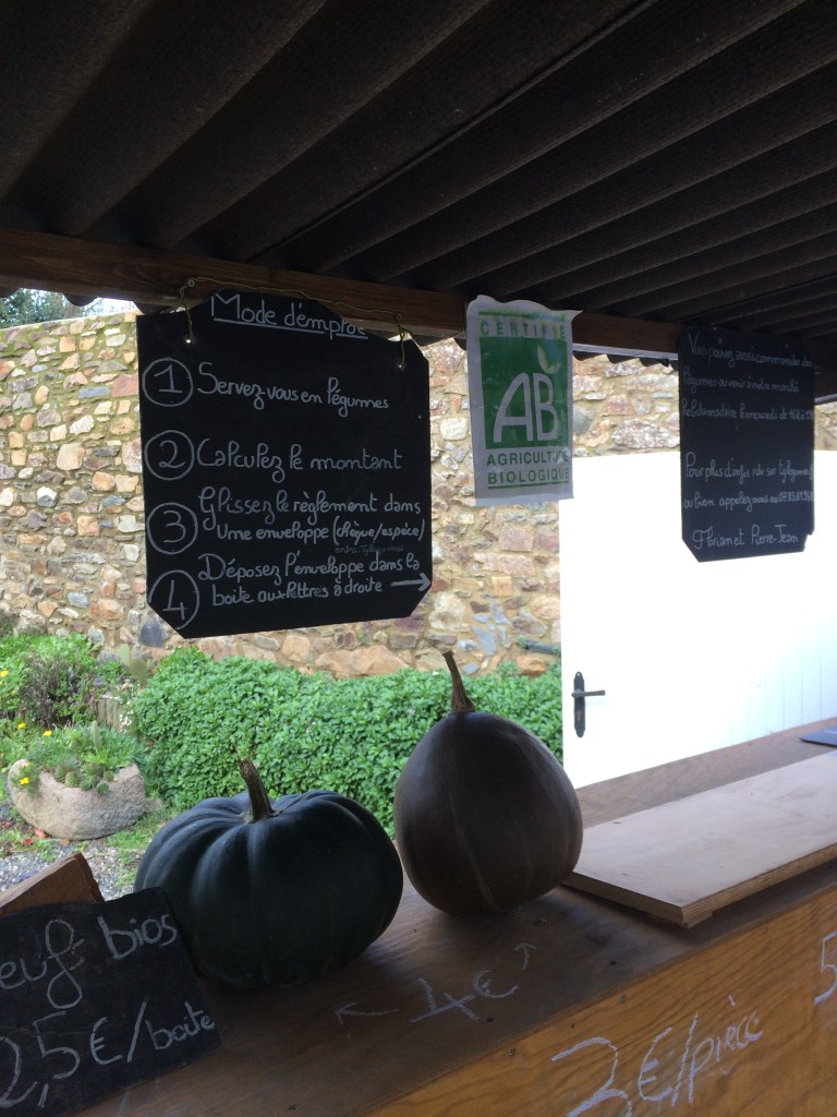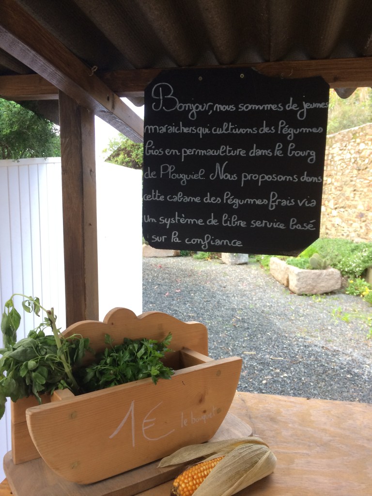 Je vous ai parlé déjà d’une vente directe de légumes bio libre service , basée à Ploezal (22) , eh bien je suis tombée sur ce même système dans le bourg de Plouguiel (22) . Je suis toujours heureuse de trouver ce type de point de vente basés sur la confiance. Même si visiblement il y a eu des abus, car le maraîcher a dû poser une caméra de sécurité.