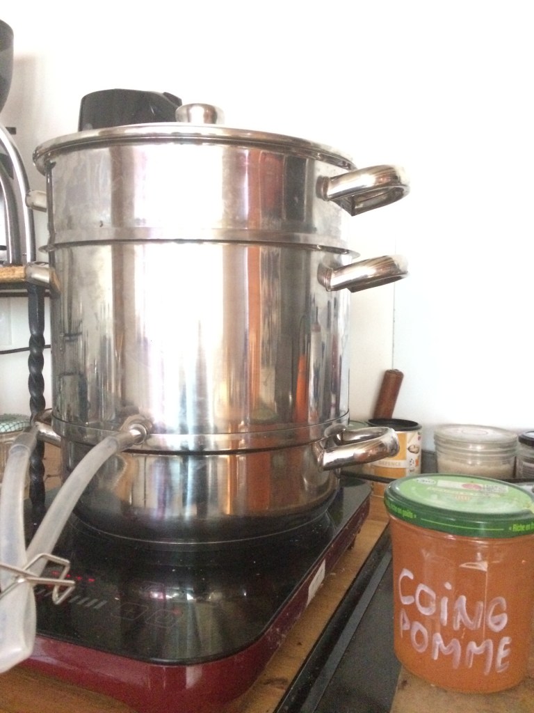J’ai eu le plaisir il y a quelque temps de trouver dans un vide grenier permanent un extracteur de jus d’occasion, de la marque Le parfait (gage de qualité) en très bonne état. Ce qui m’a permis de faire des gelées de pommes et coings . Vivement l’été prochain pour tester la gelée de petits fruits rouges ! (désolée la photo moche)