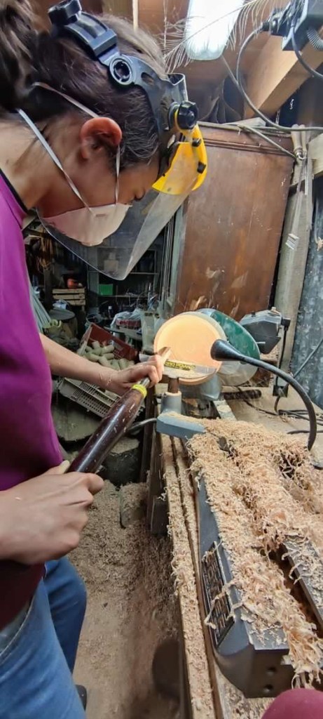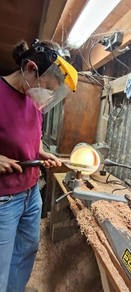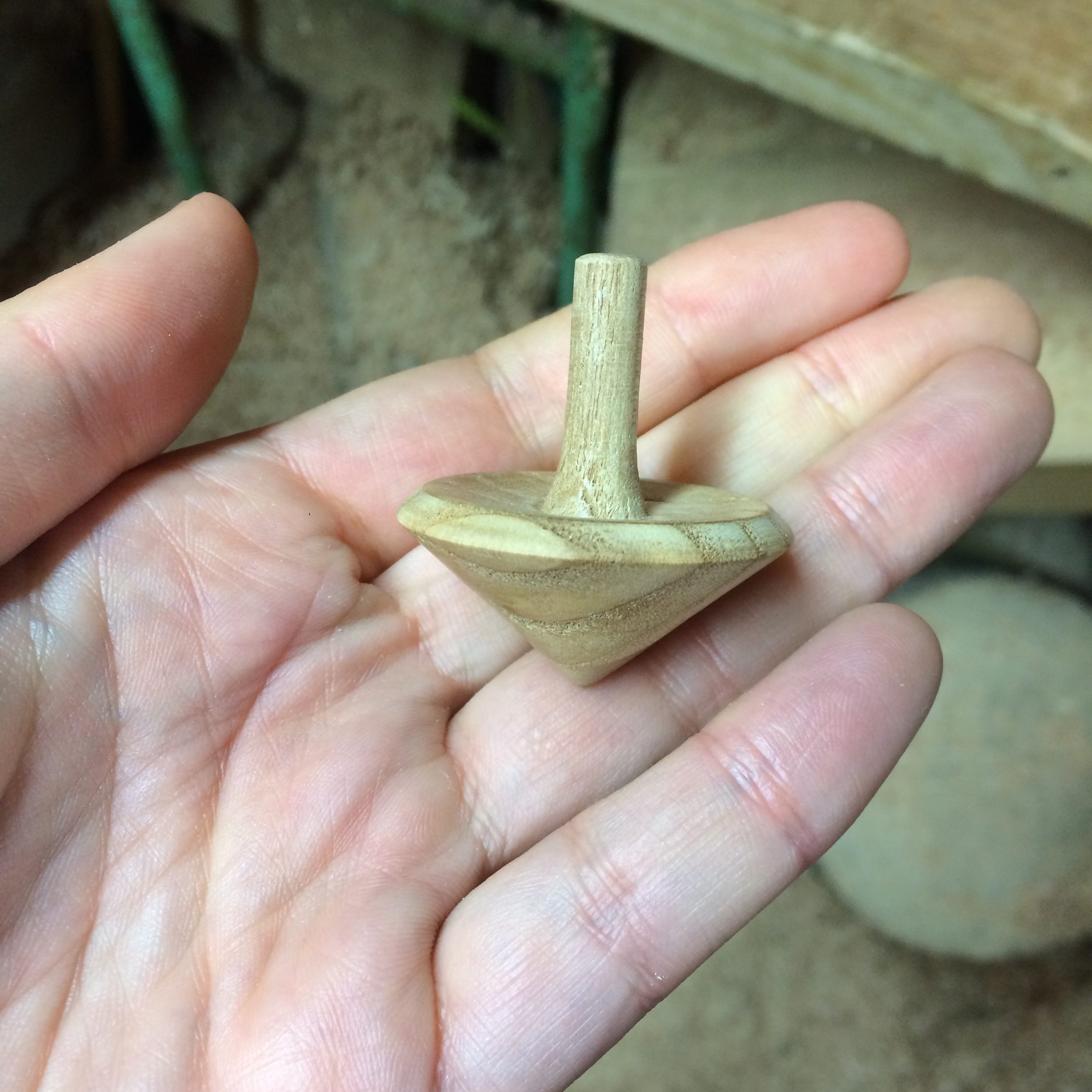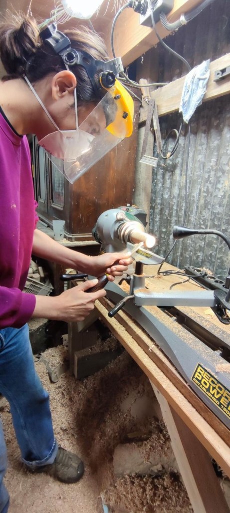 Durant la matinée , j’ai appris à appréhender la machine qui est assez impressionnante. Je sens la puissance, il faut trouver la bonne inclinaison de la gouge et la bonne pression. Pas évident, mais Guillaume est très rassurant et patient. Je suis hypnotisée par les copeaux qui se forment , le morceaux de bois qui se transforme. Pour commencer , j’ai crée deux toupies !
