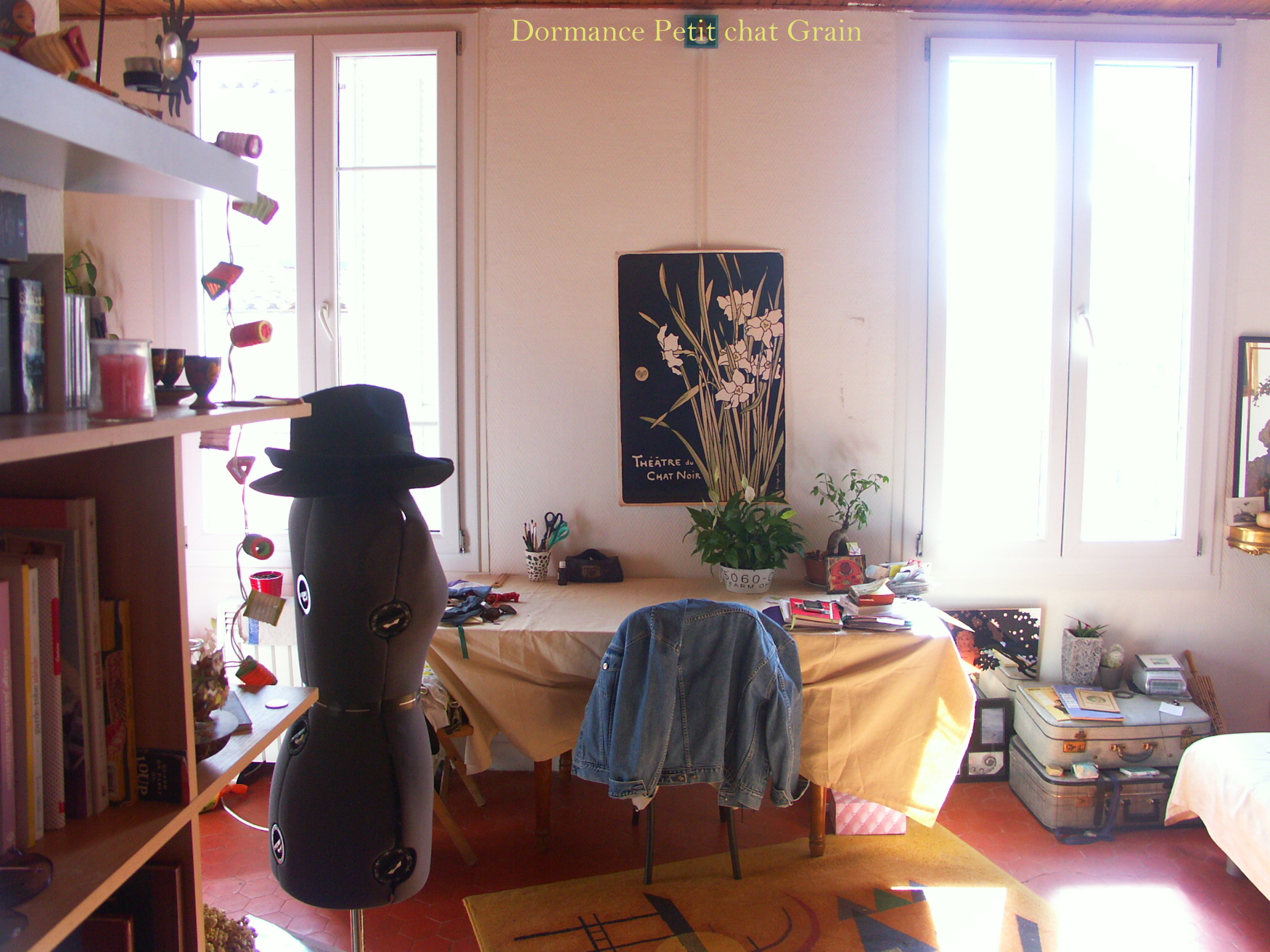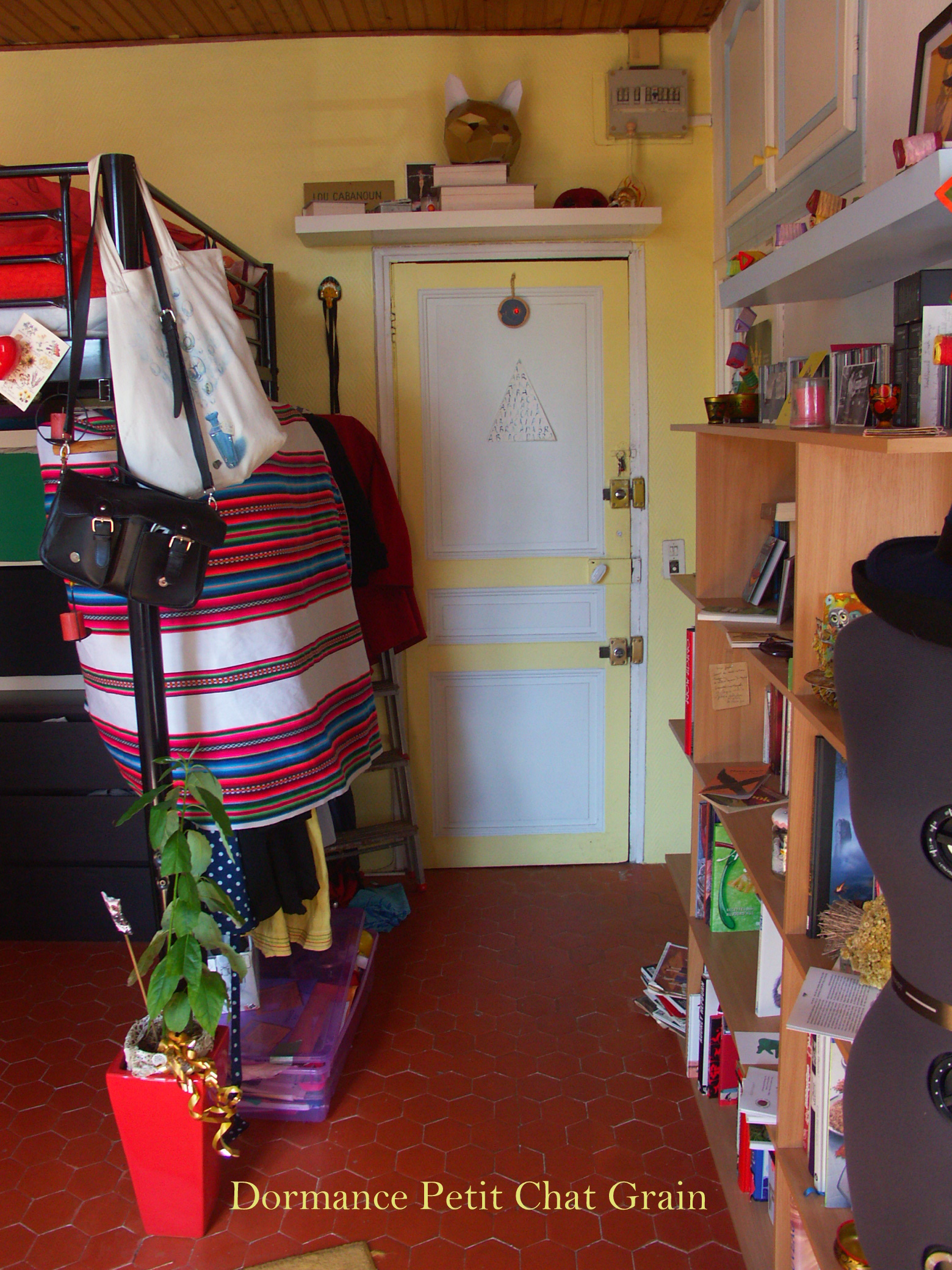 Sur la porte j’ai mes petits grigris. Un triangle de protection abracadabra que j’ai écrit à la plume et qui me suit depuis ma chambre d’ado. Mon chat « magique » (c’est moi qui lui ai prêté ce pouvoir) trouvé sur un marché de Noël, fabriqué par un créateur italien. Et une tête de Ganesh, offerte ou plutôt troquée contre des sacs que j’avais cousu, avec un collègue de travail. Sur l’étagère, il y a trois petits détails que j’aime et qui me suivent aussi depuis longtemps. Une bougie de l’église des Baux de Provence. Une illustration que j’avais trouvé à Vannes (Bretagne) qui représente une funambule dont le fil surplombe une galaxie, avec dans ses cheveux une sorte de couronne d’épines. Elle semble forte et pleine d’assurance. Enfin, un élément cher à mon coeur (mais comme tous les objets présents chez moi vous verrez) un panneau qu’avait fait mon grand père maternel où il est écrit: Lou cabanoun d’A. . A l’époque, je ne vivais pas encore dans le Sud, mais en Champagne. Je venais chez mes grands parents pour les vacances. Un été, j’ai eu l’immense joie de trouvé une cabane fabriqué par mon papi, en tissus et en bois. Avec cet écriteau dessus, c’était bien ma petite maison, sans aucun doute !