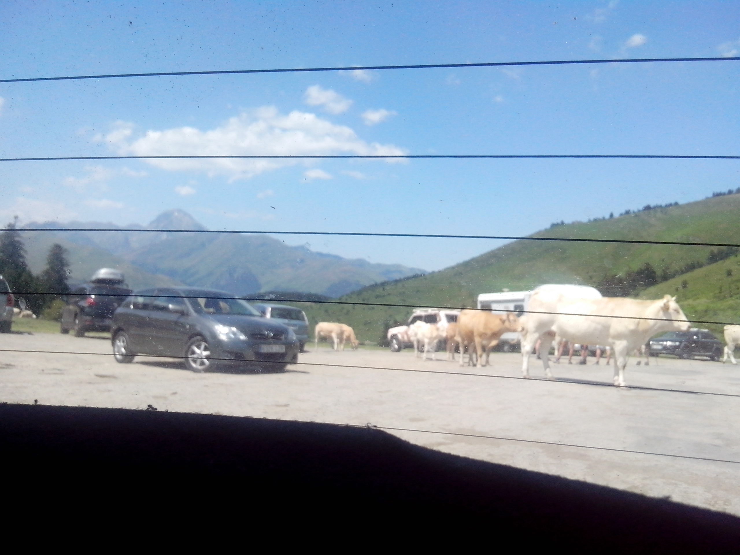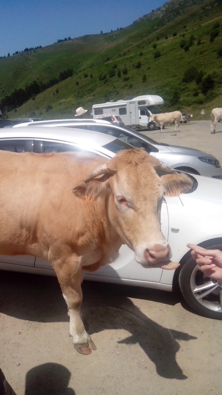 - Dans les Pyrénées , atteignant un col pour profiter d’un beau panorama. Nous avons découvert tout un tas de vaches avec leurs veaux -ados en plein milieu de la route ! C’était une vision incroyable , j’ai adoré cette sensation d’être clairement sur leur territoire. Nous étions chez elles et pas le contraire ,obligés de zigzaguer avec les voitures pour passer , car elles ne bougeaient pas d’un iota. Elles n’étaient pas du tout sauvages, j’en ai profité avec prudence (sacrées cornes pointues !) pour caresser le museau de l’une d’entre elles. J’étais comme une gosse.
