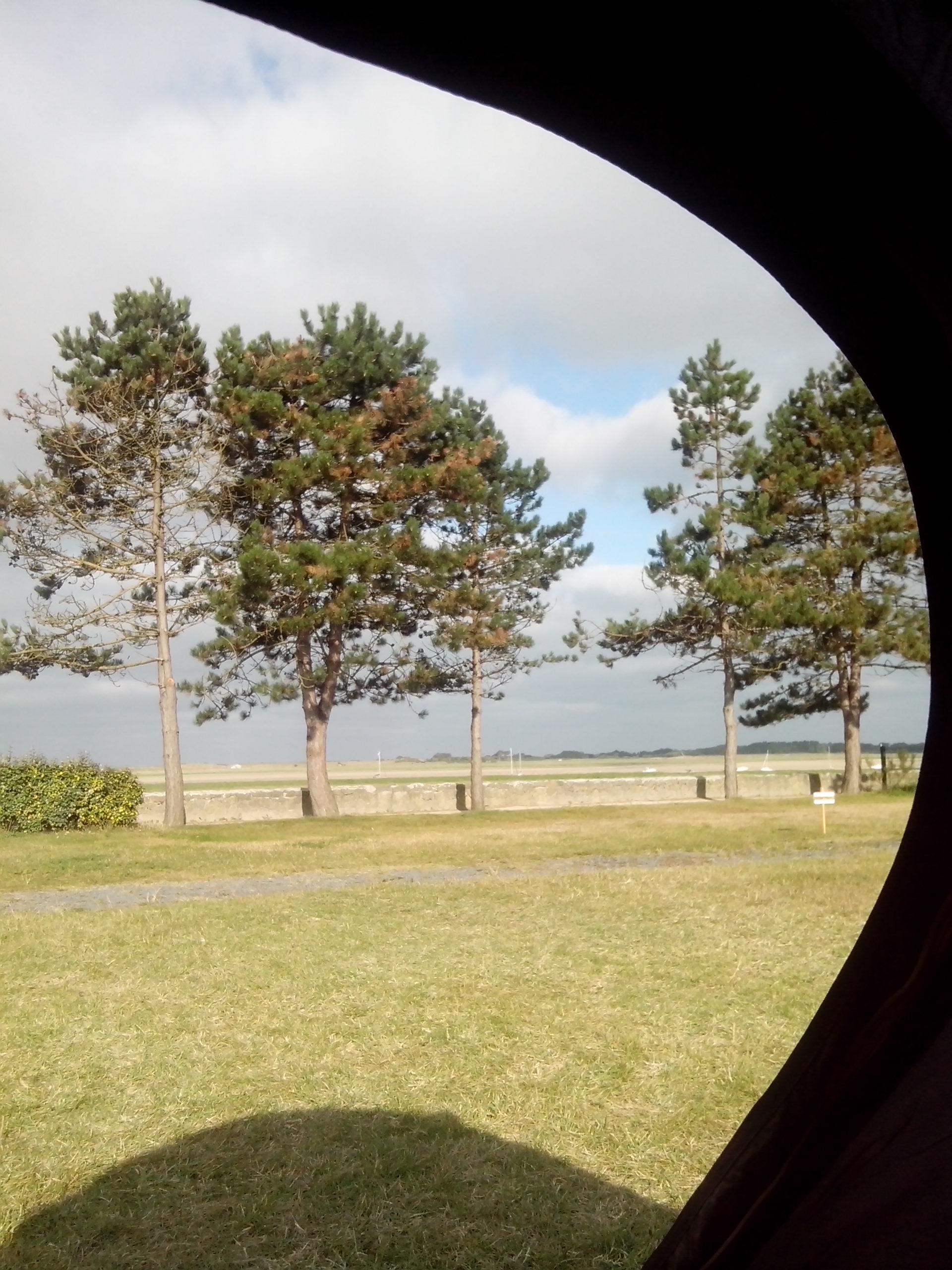 - En Normandie. J’ai réalisé un rêve et un défi en même temps. Je suis partie randonner seule, ce que j’ai déjà fait, mais c’est toujours l’aventure. Pour atteindre un village de la Manche que j’aime beaucoup : Regnéville sur mer. C’est le lieu où j’allais lorsque j’avais un coup de grisou, la vue sur le havre m’apaisait. Et en plus il y a un super magasin de tissus là bas 😉 J’ai toujours lorgné sur le petit camping communal qui donne en plein sur le havre. Je me répétais, « un jour j’irais camper ici ! » Et c’est chose faite ! Et le défi fût de camper seule. Coup double ! Je n’ai pas très bien dormi, mauvais matelas et bruits de voiture. Mais quelle joie de voir le soleil se coucher sur la pointe d’Agon en face, et de me lever là , allant payer mon emplacement en pyjama , boire un thé en face des bateaux par marée basse tout en écrivant des cartes postales.