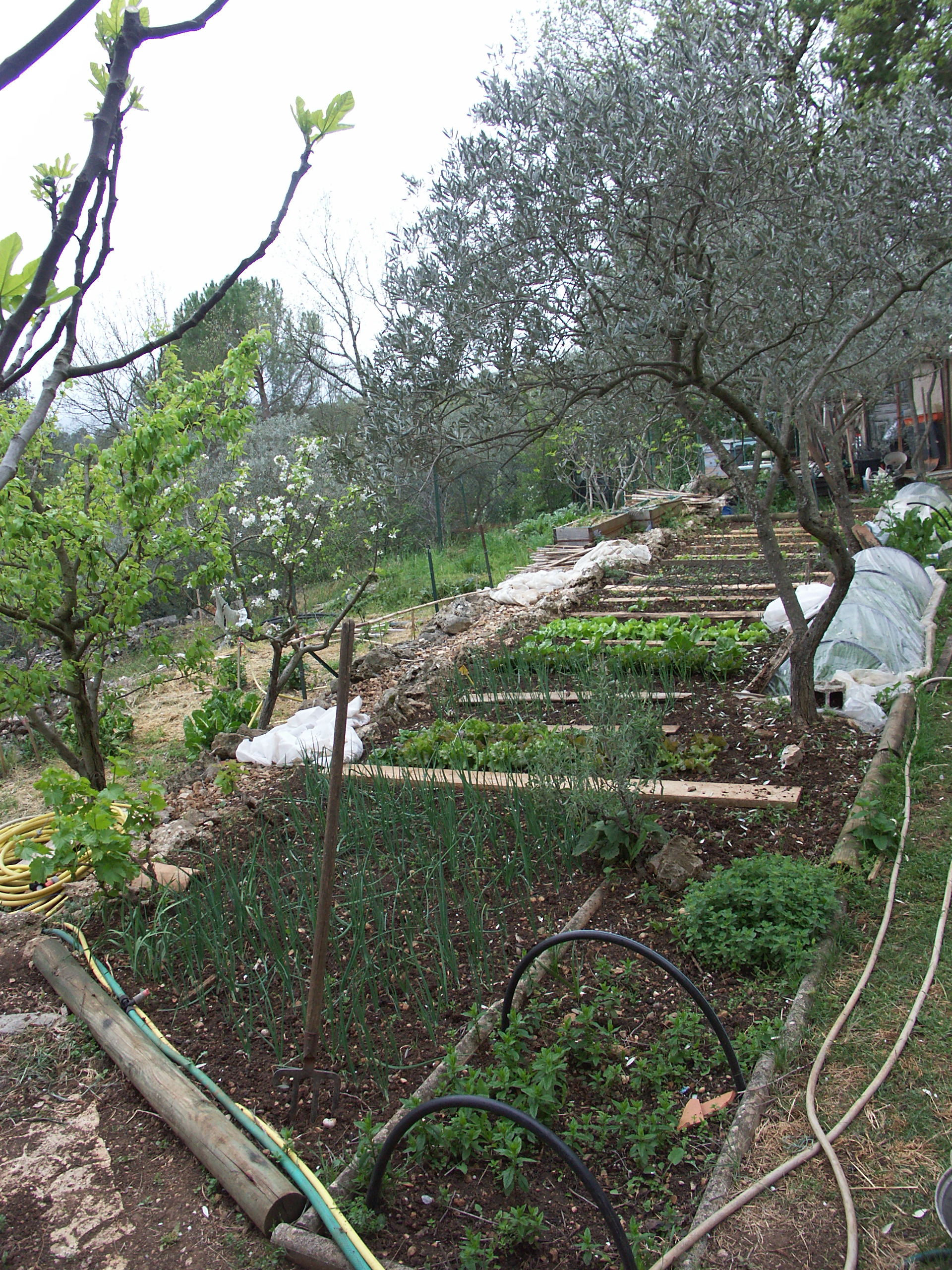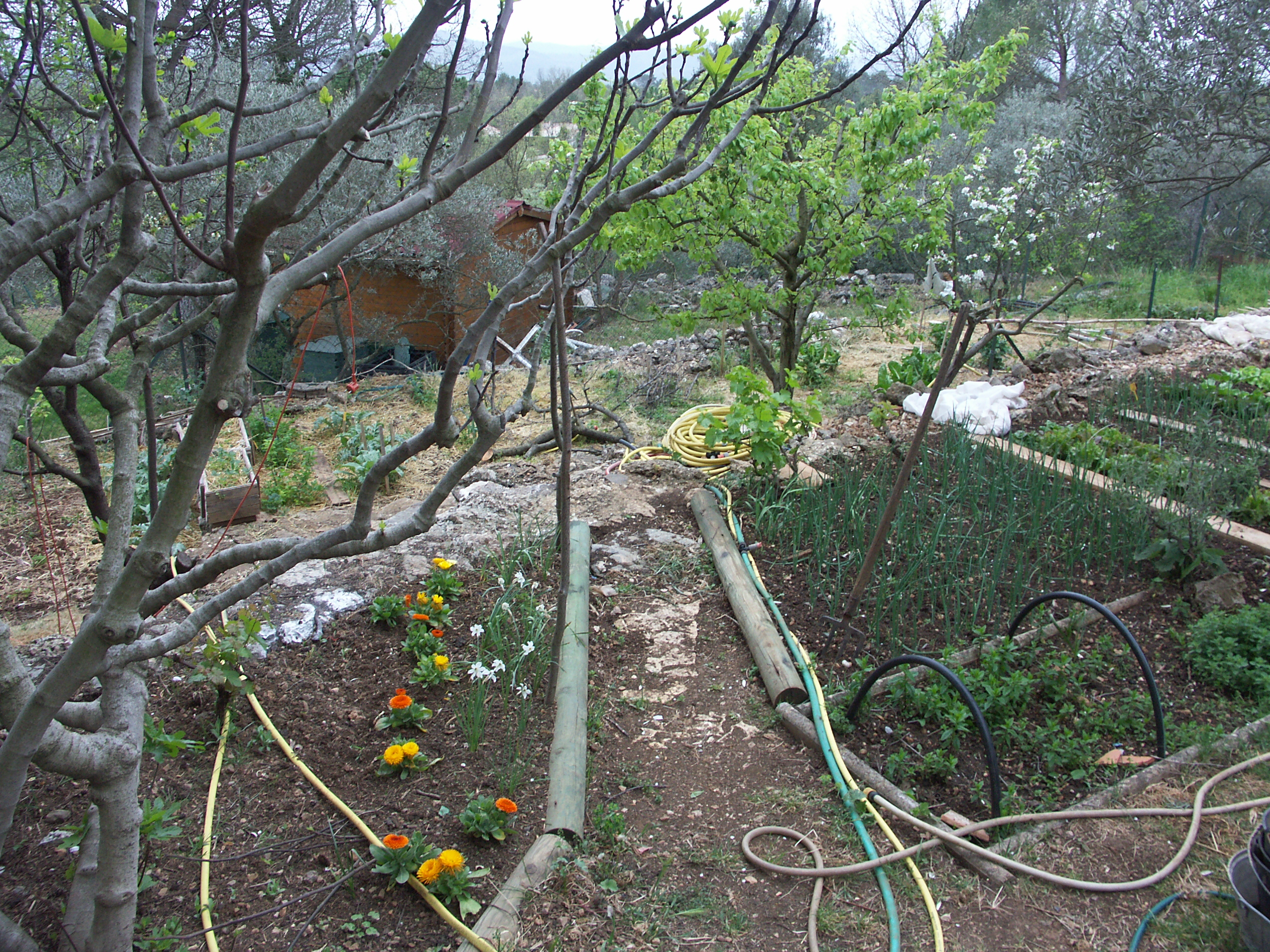 Mon père est de cette génération où l’on fait le maximum soi même. Depuis que nous habitons dans le sud, il s’est évertué à façonner la nature, la travailler, l’alimenter, en fonction de la lune et des saisons. Avec à son coin, un grand compost, enrichi parfois de crottin de cheval ou de chèvre troqué. A l’ombre d’oliviers et d’arbres fruitier. Sans pesticides. Où les fleurs s’amourachent de poireaux pour faire face aux envahisseurs Au plus grand plaisir de nos papilles. Je suis en admiration devant tout ce que cela représente, j’aimerai avoir la patience de faire de même. Pour l’instant je joue à l’apprentie jardinière parfois, m’y atteler tous les jours serait une autre histoire. Comme il m’ait arrivé de publier des photos de ce potager, voire même d’envoyer de la verveine ou de la mélisse à certaines d’entre vous. Il est bien juste de rendre à César ce qui lui appartient ! Voici donc quelques images au file des saisons de ce jardin magique.