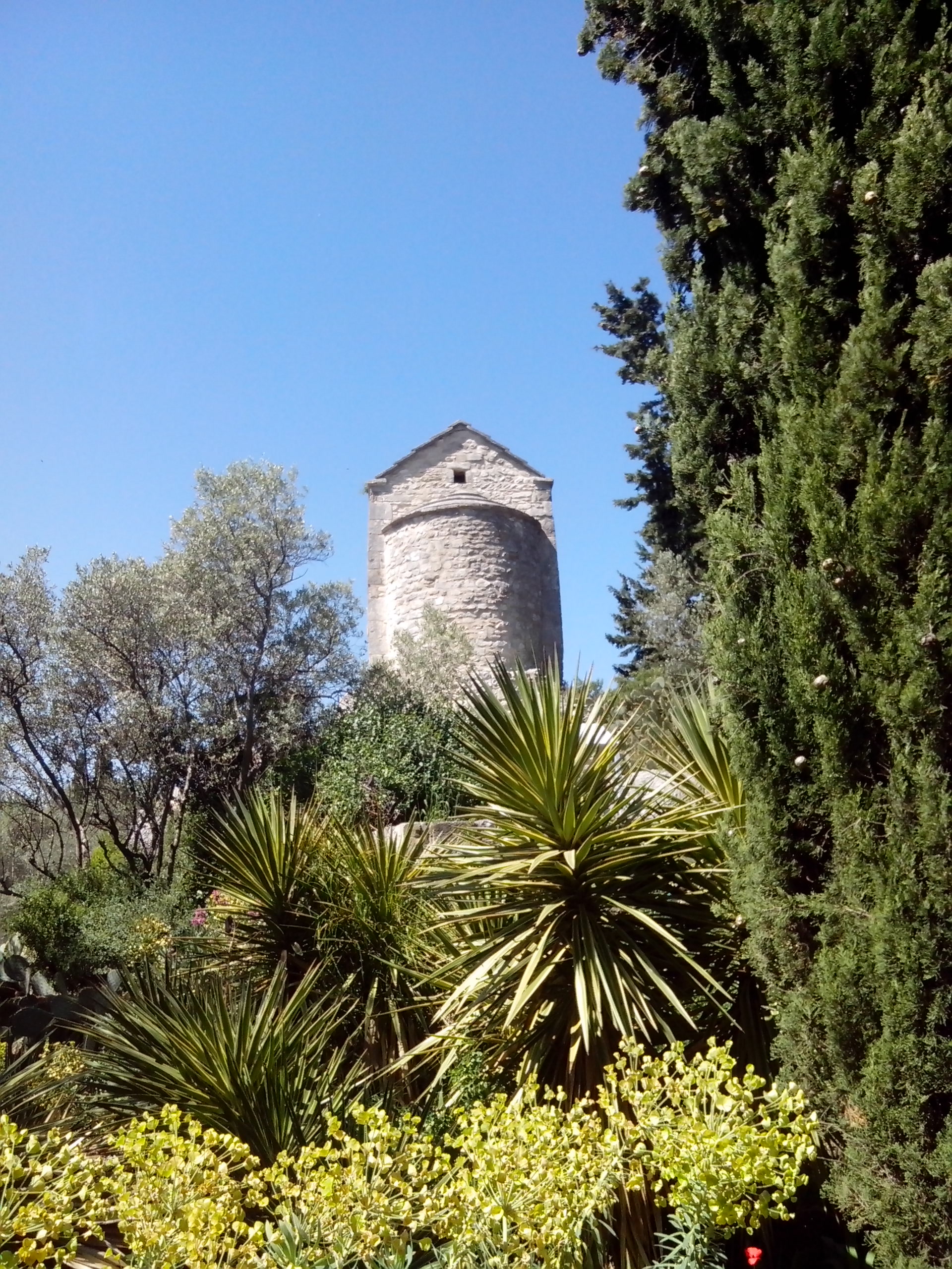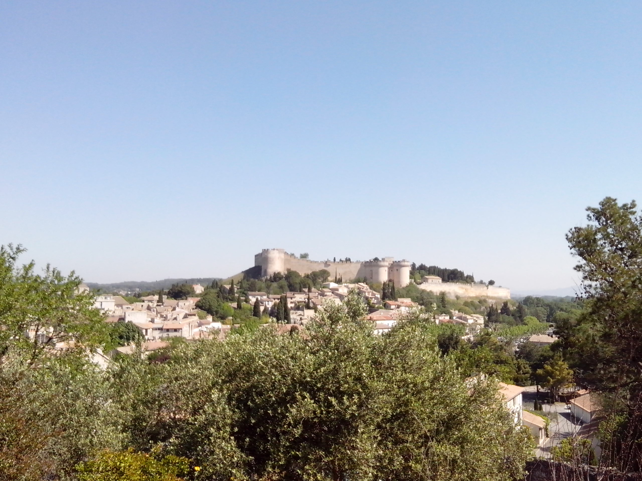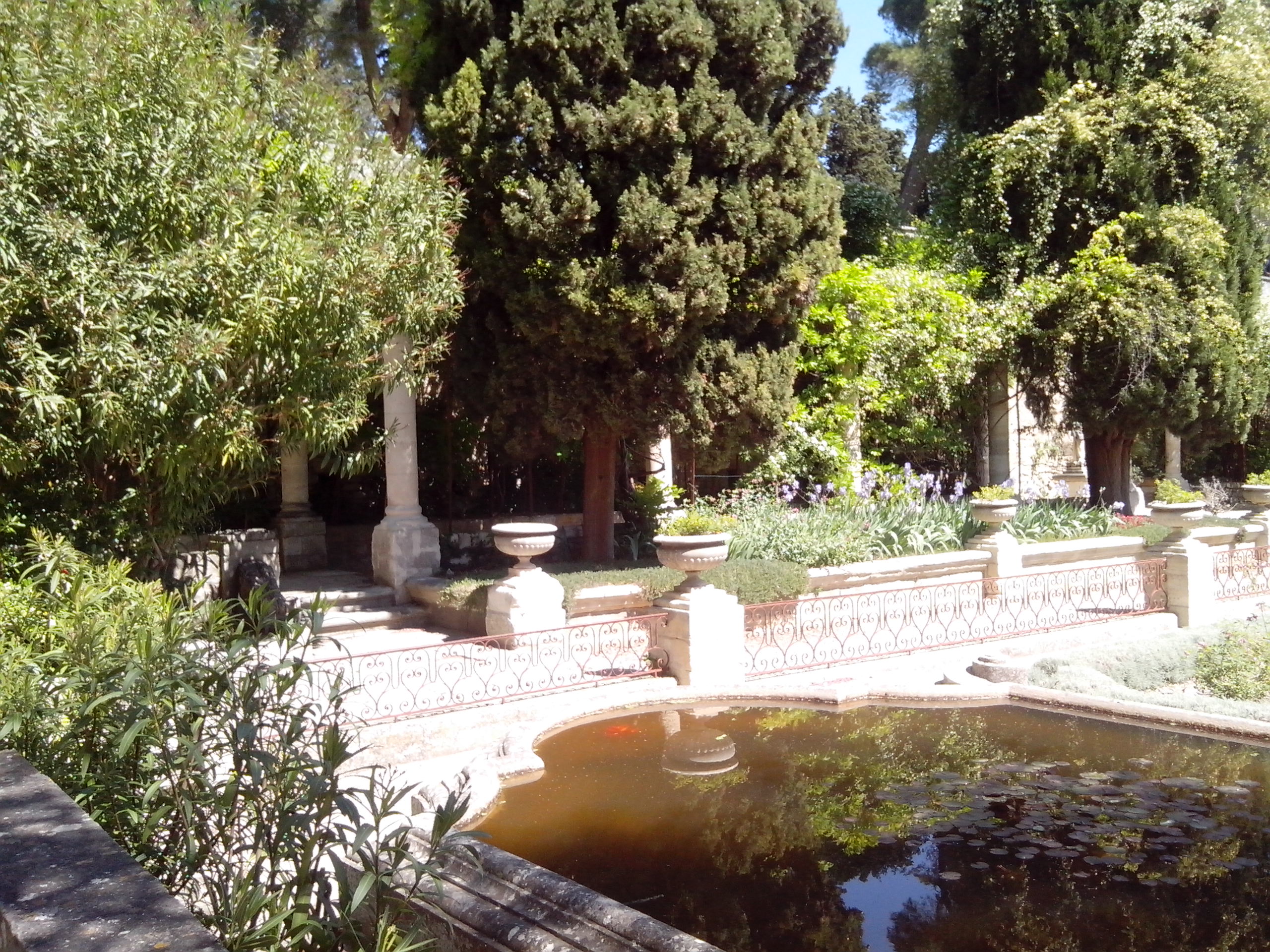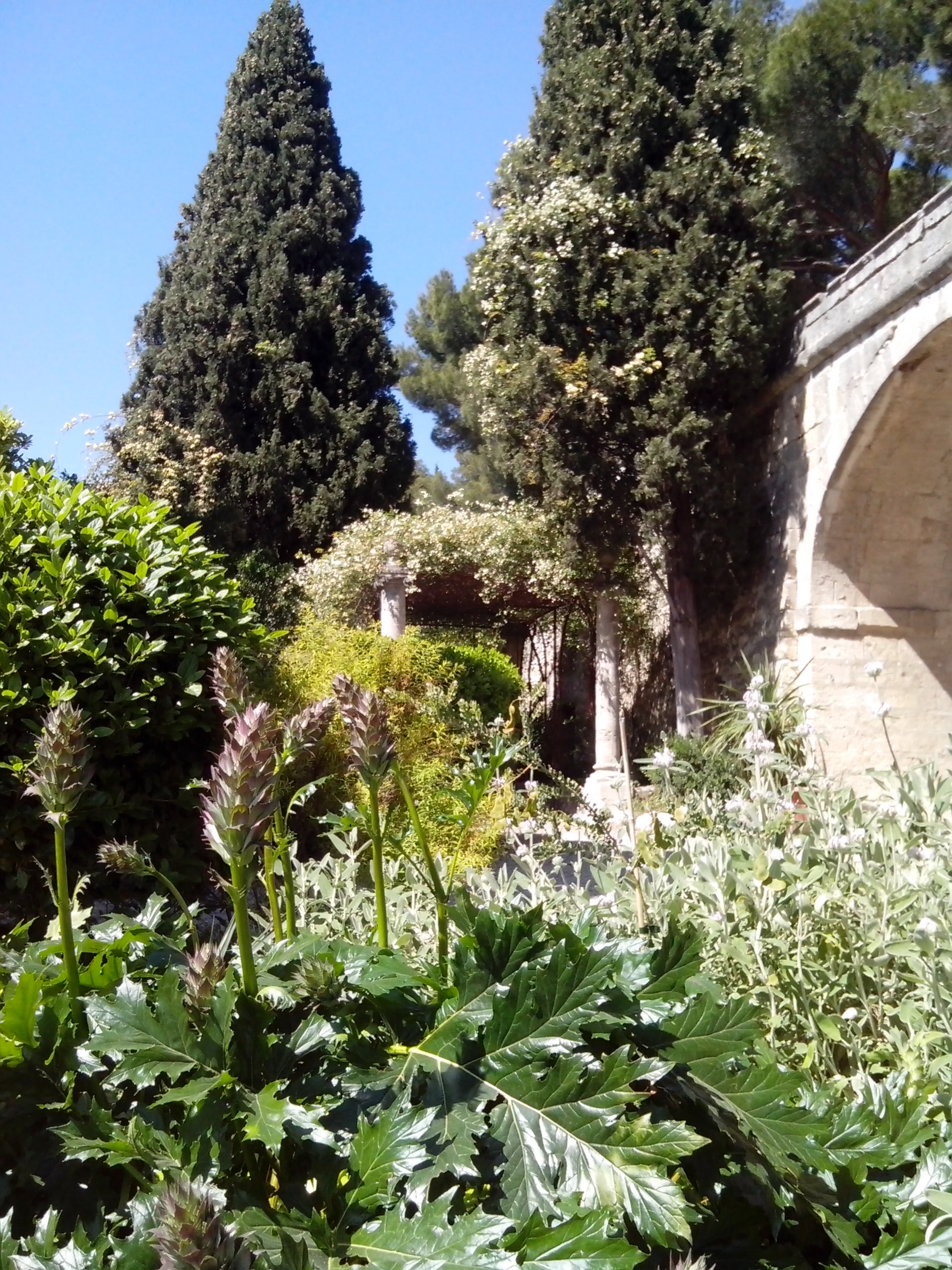 Le ventre plein et la mine joyeuse, il était temps de prendre le bus pour Villeneuve -lez-Avignon. Point important que nous avons appris ce jour. Même si seulement le Rhône la sépare d’Avignon, cette ville ne fait pas partie du même département, ni de la même académie. Donc sur les horaires de bus pour les périodes scolaires, faites attention, regarder bien si c’est un transport en commun du Gard ou du Vaucluse. Une fois sorties au niveau de la Tour Philippe Le bel, en longeant de belles bastides aux pierres apparentes et couvertes de glycines, il est facile de rejoindre le parc de Mourges , qui doucement mais sûrement nous fait grimper sur la colline. En plus d’y avoir un belle vue, on y trouve, une chapelle, un théâtre de verdure et d’autres vestiges des temps passés.